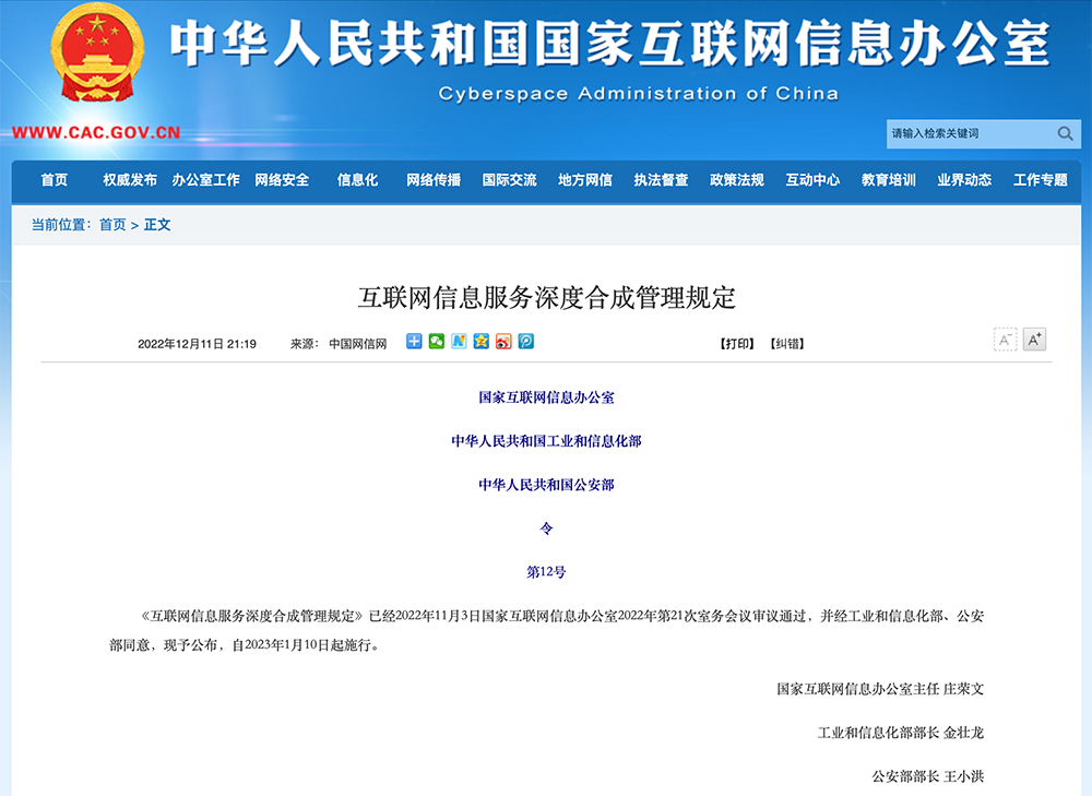 近年来,深度合成技术快速发展,在服务用户需求、改进用户体验的同时,也被一些不法人员用于制作、复制、发布、传播违法和不良信息,诋毁、贬损他人名誉、荣誉,仿冒他人身份实施诈骗等,影响传播秩序和社会秩序,损害人民群众合法权益,危害国家安全和社会稳定。出台《规定》,是防范化解安全风险的需要,也是促进深度合成服务健康发展、提升监管能力水平的需要。《规定》明确了深度合成相关用语的含义,以及制定目的依据、适用范围、部门职责、导向要求、监督检查与法律责任;明确在中华人民共和国境内应用深度合成技术提供互联网信息服务,适用本规定。国家互联网信息办公室有关负责人指出,深度合成服务治理需要政府、企业、社会、网民等多方主体共同参与,推动深度合成技术的依法、合理、有效使用,积极防范化解深度合成技术带来的风险,促进互联网信息服务健康发展,维护网络空间良好生态。第一条 为了加强互联网信息服务深度合成管理,弘扬社会主义核心价值观,维护国家安全和社会公共利益,保护公民、法人和其他组织的合法权益,根据《中华人民共和国网络安全法》、《中华人民共和国数据安全法》、《中华人民共和国个人信息保护法》、《互联网信息服务管理办法》等法律、行政法规,制定本规定。第二条 在中华人民共和国境内应用深度合成技术提供互联网信息服务(以下简称深度合成服务),适用本规定。法律、行政法规另有规定的,依照其规定。第三条 国家网信部门负责统筹协调全国深度合成服务的治理和相关监督管理工作。国务院电信主管部门、公安部门依据各自职责负责深度合成服务的监督管理工作。地方网信部门负责统筹协调本行政区域内的深度合成服务的治理和相关监督管理工作。地方电信主管部门、公安部门依据各自职责负责本行政区域内的深度合成服务的监督管理工作。第四条 提供深度合成服务,应当遵守法律法规,尊重社会公德和伦理道德,坚持正确政治方向、舆论导向、价值取向,促进深度合成服务向上向善。第五条 鼓励相关行业组织加强行业自律,建立健全行业标准、行业准则和自律管理制度,督促指导深度合成服务提供者和技术支持者制定完善业务规范、依法开展业务和接受社会监督。第六条 任何组织和个人不得利用深度合成服务制作、复制、发布、传播法律、行政法规禁止的信息,不得利用深度合成服务从事危害国家安全和利益、损害国家形象、侵害社会公共利益、扰乱经济和社会秩序、侵犯他人合法权益等法律、行政法规禁止的活动。深度合成服务提供者和使用者不得利用深度合成服务制作、复制、发布、传播虚假新闻信息。转载基于深度合成服务制作发布的新闻信息的,应当依法转载互联网新闻信息稿源单位发布的新闻信息。第七条 深度合成服务提供者应当落实信息安全主体责任,建立健全用户注册、算法机制机理审核、科技伦理审查、信息发布审核、数据安全、个人信息保护、反电信网络诈骗、应急处置等管理制度,具有安全可控的技术保障措施。第八条 深度合成服务提供者应当制定和公开管理规则、平台公约,完善服务协议,依法依约履行管理责任,以显著方式提示深度合成服务技术支持者和使用者承担信息安全义务。第九条 深度合成服务提供者应当基于移动电话号码、身份证件号码、统一社会信用代码或者国家网络身份认证公共服务等方式,依法对深度合成服务使用者进行真实身份信息认证,不得向未进行真实身份信息认证的深度合成服务使用者提供信息发布服务。第十条 深度合成服务提供者应当加强深度合成内容管理,采取技术或者人工方式对深度合成服务使用者的输入数据和合成结果进行审核。深度合成服务提供者应当建立健全用于识别违法和不良信息的特征库,完善入库标准、规则和程序,记录并留存相关网络日志。深度合成服务提供者发现违法和不良信息的,应当依法采取处置措施,保存有关记录,及时向网信部门和有关主管部门报告;对相关深度合成服务使用者依法依约采取警示、限制功能、暂停服务、关闭账号等处置措施。第十一条 深度合成服务提供者应当建立健全辟谣机制,发现利用深度合成服务制作、复制、发布、传播虚假信息的,应当及时采取辟谣措施,保存有关记录,并向网信部门和有关主管部门报告。第十二条 深度合成服务提供者应当设置便捷的用户申诉和公众投诉、举报入口,公布处理流程和反馈时限,及时受理、处理和反馈处理结果。第十三条 互联网应用商店等应用程序分发平台应当落实上架审核、日常管理、应急处置等安全管理责任,核验深度合成类应用程序的安全评估、备案等情况;对违反国家有关规定的,应当及时采取不予上架、警示、暂停服务或者下架等处置措施。第十四条 深度合成服务提供者和技术支持者应当加强训练数据管理,采取必要措施保障训练数据安全;训练数据包含个人信息的,应当遵守个人信息保护的有关规定。深度合成服务提供者和技术支持者提供人脸、人声等生物识别信息编辑功能的,应当提示深度合成服务使用者依法告知被编辑的个人,并取得其单独同意。第十五条 深度合成服务提供者和技术支持者应当加强技术管理,定期审核、评估、验证生成合成类算法机制机理。深度合成服务提供者