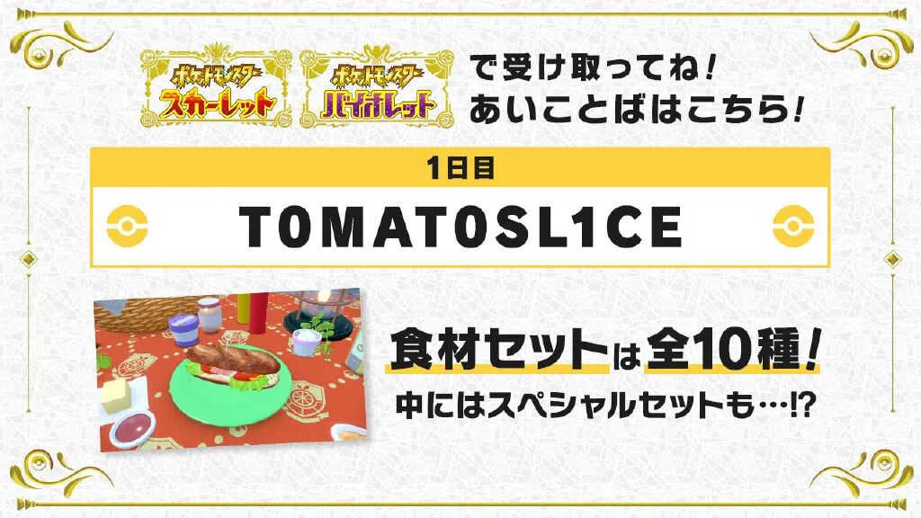 官方发布《宝可梦 朱/紫》神秘礼物兑换码【T0MAT0SL1CE】,内容为“食材套装10种(随机)”。