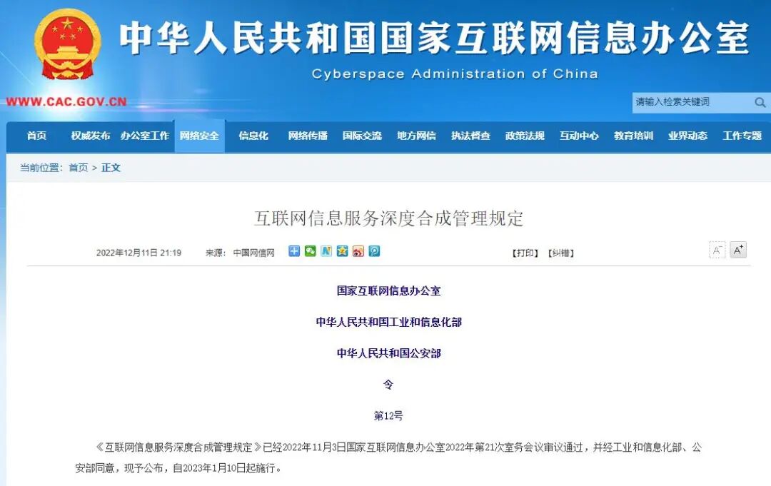 近日,国家互联网信息办公室、工业和信息化部、公安部联合发布《互联网信息服务深度合成管理规定》(以下简称《规定》),自2023年1月10日起施行。在经历了近一年的公示、讨论、修改后,包括人脸替换、合成人声、图像生成在内的各种AI应用,在国内也将正式迈入法制时代。