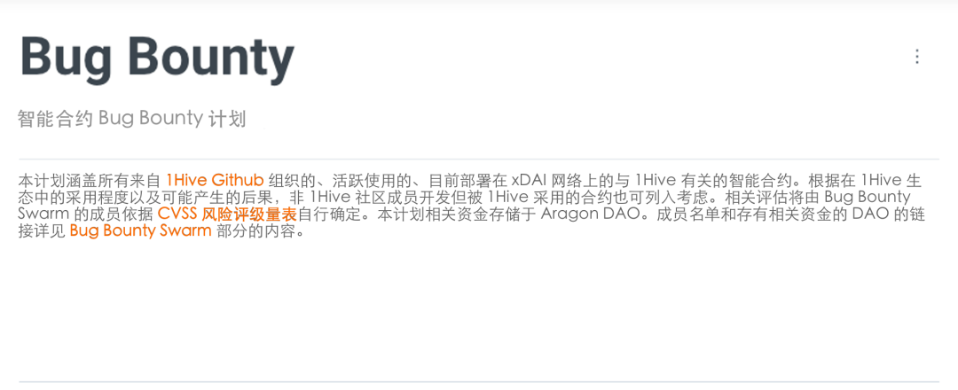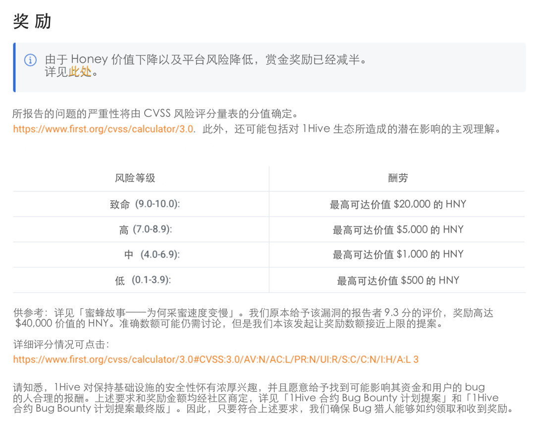 每一个 Bounty 都应该得到相应的薪酬。许多 DAO 使用 Web2 市场价格来确定 Bounty 的薪酬。基于 CVSS 风险评级量表,1Hive 提供了详细的薪酬结构,同时还给出了 Bug Bounty 过往的评分示例。这样的透明度有助于潜在贡献者决定是否有意去完成该 Bounty。