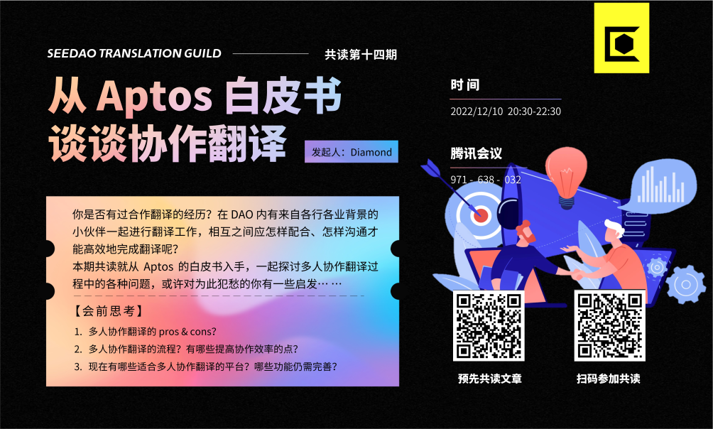 你是否有过合作翻译的经历?在 DAO 内有来自各行各业背景的小伙伴一起进行翻译工作,相互之间应怎样配合、怎样沟通才能高效地完成翻译呢?上周翻译公会的共读就从 Aptos 的白皮书入手,一起探讨多人协作翻译过程中的各种问题,或许对为此犯愁的你也会有一些启发……
