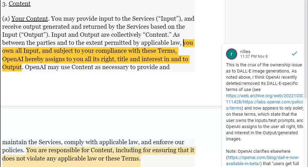项目还是前几期念叨过的AI伦理、AI商业模式、AI法务这三大件,毕竟本来就是WM第三季研究的主题嘛。其中,AI法务这块已经有了些成果,一位大佬共享了DALL.E2的Terms of Service分析https://docs.google.com/document/d/1vFbTLOw9A6av_0E_cuTW-j8fftdBUJnIlbWj6EEOVbE/edit,另一位做了Stability AI的(https://docs.google.com/document/d/1LBqJ381PCCjVTlIHeQ5Y9bbXKVZwYgIplkY_V7hwmmY/edit)招人就是为了完善它们。