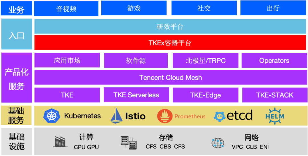 上图是自研上云涉及的相关产品的简单架构。最底层是 IaaS 腾讯云计算网络存储,往上层的基础服务主要是 Kubernetes、ETCD、Helm,再往上是腾讯云的产品化服务,包括腾讯 TKE 产品、TKE Serverless、Edge、TKE-STACK。TKEx 容器平台服务腾讯内部业务,内部入口可以直接是容器平台或者研效平台。