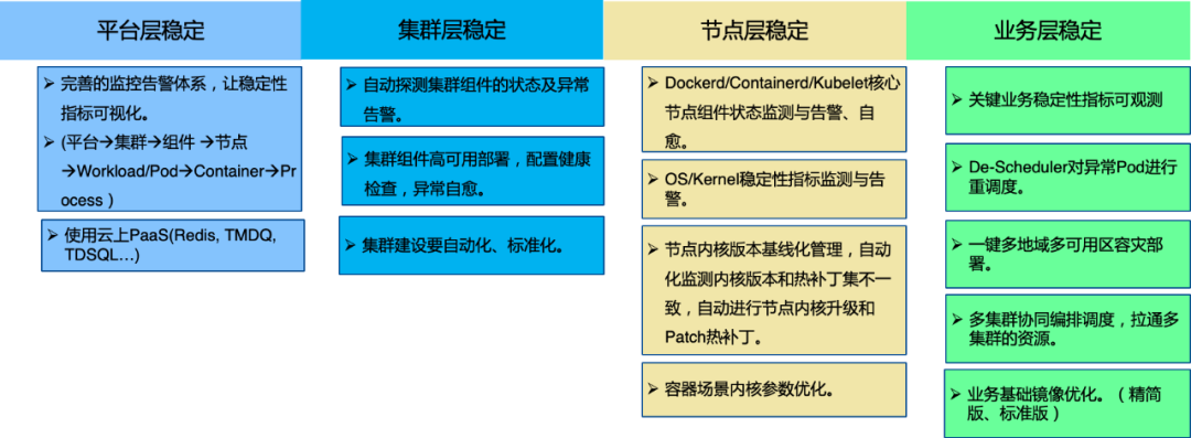 负载上升之后会面临很多稳定性问题,我们主要关注平台层、集群层、节点层以及业务层的稳定性。