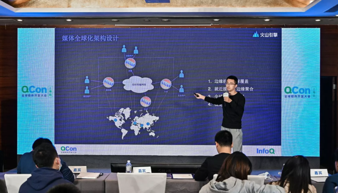 讲师在介绍 RTC 媒体全球化架构设计要点