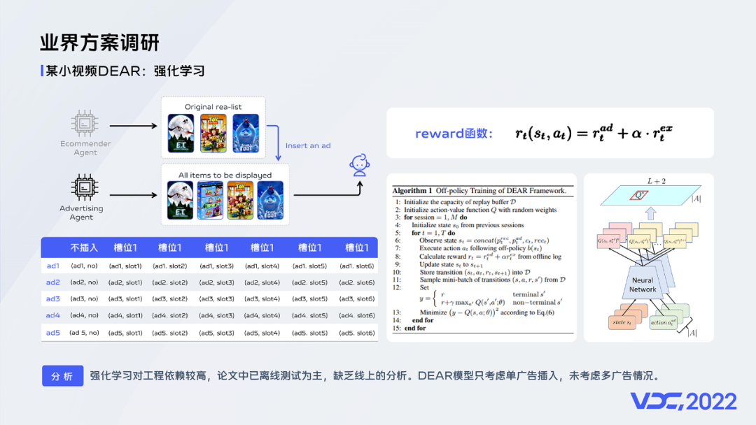 接下来介绍的是某小视频的方案,他们采用强化学习的方法进行混排。该方案将信息流混排问题抽象为序列插入问题,将不同广告对于不同槽位的插入情况抽象为不同 action,通过强化学习进行选择。在考虑奖励设计时融合了广告价值(如收入等)与用户体验价值(比如下滑与离开)。通过调节超参对两者进行平衡。