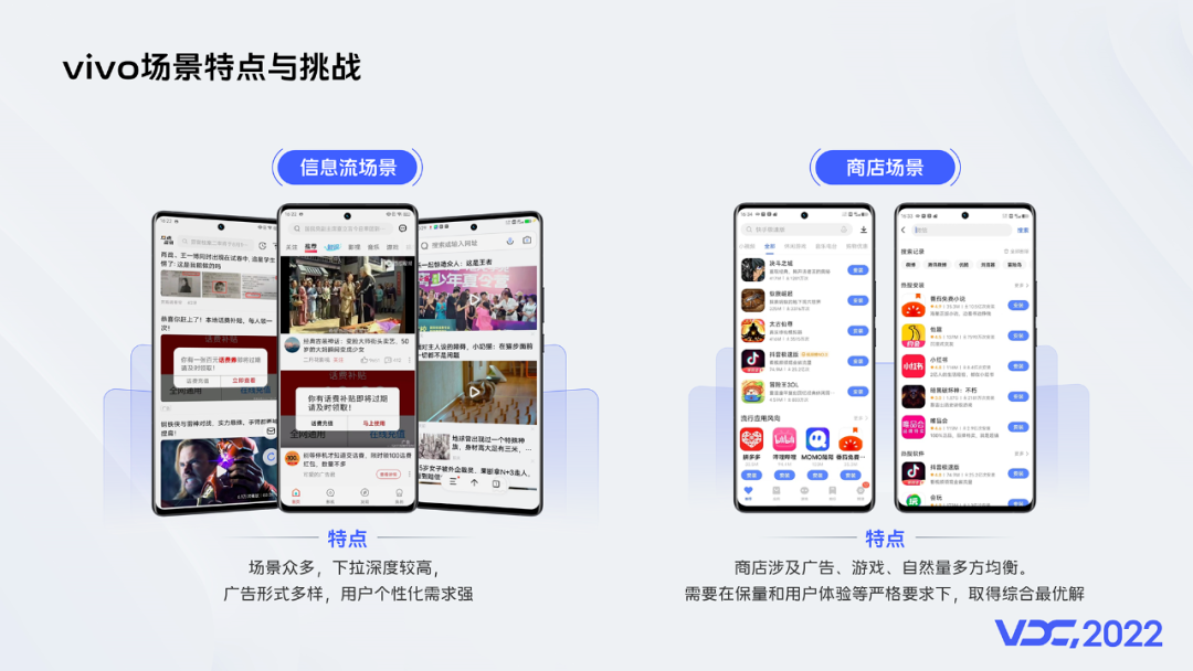 vivo 的信息流场景,包括像浏览器、i 视频、负一屏等,他的特点是场景众多,下拉深度较高,广告形式多样,用户个性化需求较强。而对于商店场景,是一个整体偏垂直的场景,