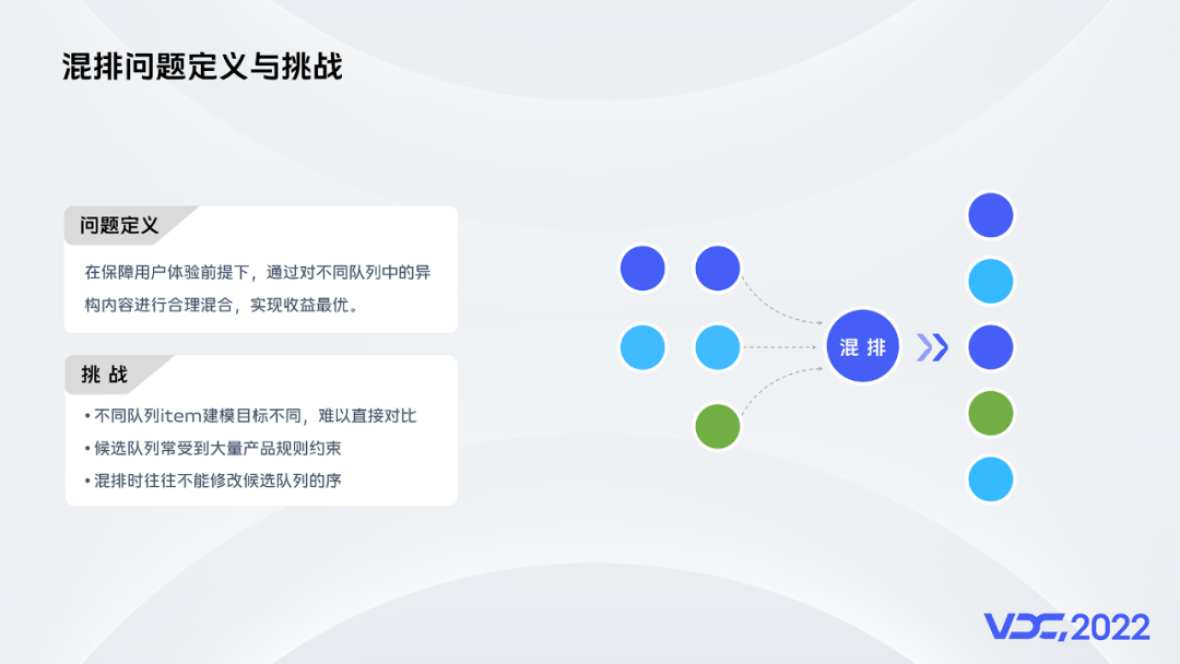首先介绍一下什么是混排。所谓混排,如图所示就是需要在保障用户体验前提下,通过对不同队列中的异构内容进行合理混合,实现收益最优,更好的服务广告主和用户。