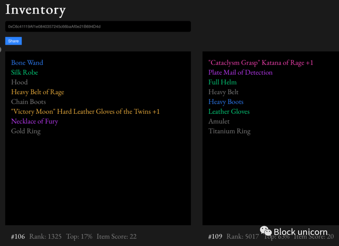 该0xInventory.app网站正在呈现虚拟实境的更高分辨率的版本,因为它涉及到的战利品令牌。它使用嵌入在令牌中的属性对其前端进行外观更改。这些变化是原始而简单的;标识对象的文本已根据稀有程度更改颜色。