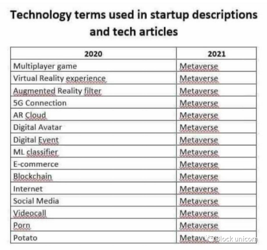 这张图片最近在 Twitter 上与我分享。从表面上看,它说明了“元宇宙”这个词被过度炒作的本质,以及它是如何非描述性的,以至于实际上没有说明任何内容。