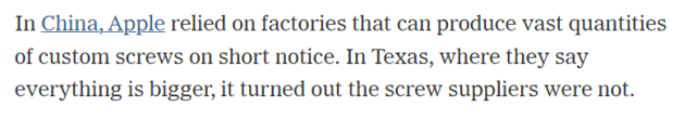 苹果正积极寻求将生产从中国转移到亚洲其他国家,包括印度和越南。关于这个消息,市场普遍认为是郑州富士康 11 月因疫情造成的 iPhone 减产刺激了苹果公司。郑州富士康工厂有近 30 万工人,苹果的 iPhone Pro 系产品,一度有 85% 的出货来自于这里。iPhone 14 Pro / 14 Pro Max 公开发售 10 周后,消费者下单所需等待收货时间为 37 天。而在 iPhone 13 和 12 代时,这个时间分别仅为 15 天和 2 天。如此漫长的等待时间,势必会影响到 iPhone 的销量。比如,iPhone 的新品发布会在 9 月,发售后 10 周的时间节点是 11 月中旬,这是 iPhone 的一个销售旺季。因为在以圣诞节为主要节日的国家,很多人会把新款 iPhone 作为送给亲友的圣诞礼物,长达 37 天的等待时间会让很多人来不及准备,这些消费者极有可能会选择其他电子产品做替代。这样的窘境,让苹果不得不开始关注 “ 集中风险 ”。在过去,中国为苹果提供了合适的工人、稳定的政策和巨大的本地市场,以至于苹果的供应链出现了这样一个状况:苹果虽然在尽可能地分散自己的供应链保障供应链安全,但这些供应链公司,大部分都在中国,形成了地域集中。就在今年 10 月份,苹果公司公布了其主要供应商名单。苹果公司 98% 的采购额均流向这 190 家供应商,包括用于全球产品的材料、制造和模组等直接支出。在这 190 家企业中,有 91 家都是中国公司,占比 47.9% 。而这些供应商有近 150 家在中国大陆设有工厂,且均参与苹果相关业务,占总企业数的 79% 左右。所以,我们可以认为,中国制造在苹果供应链中占有极为重要的主导地位。对于一个把巨量产品卖向全世界的公司来讲,无论中国再好,地域如此集中的供应链,都是一个不容忽视的风险,这已经跟中美博弈或是其他政治因素无关了。毕竟连小学生都知道:鸡蛋不能放在同一个篮子里,而所有篮子,也不能全放在同一辆车上。苹果想要保持业务稳定,需要的不仅是供应链公司的分散,还需要供应链在地域上的分散。所以,知危编辑部认为,苹果供应链部分迁出中国,是一件必然的事。实际上,这不是苹果第一次面临摆脱中国供应链的问题。2011 年 2 月,美国前总统奥巴马在硅谷和众多科技行业大佬一起用餐,当苹果创始人史蒂夫·乔布斯发言时,奥巴马打断了他,反问道:要付出何种代价,才能在美国生产 iPhone ? 为什么不能在 “ 家 ” 完成这些工作呢 ?而乔布斯当时直接了当的回绝了奥巴马:“ 这些工作机会是回不来的。”首先,美国的教育是相对分层的,要么是精英,要么受教育程度较差。这导致了具有一定知识水平,但愿意去工厂 “ 打螺丝 ” 的人群并不多,而这样的工人中国却有很多。这不是知危编辑部臆想出来的,苹果现任 CEO 库克曾亲口表达过这个意思,他 2015 年在接受美国 60minutes 采访时对记者说:“ 中国非常重视制造业。在我们的谈话中,你和我会称之为职业技能。随着时间的推移,美国开始不再拥有那么多的职业技能。我的意思是,你可以把美国的每一个工具和模具制造商都放在我们现在所在的房间里。而在中国,你必须有好几个足球场才能放得下这些技术人员。”人们经常陷入一个误区,苹果这样的公司来中国建工厂是因为人力成本便宜,其实近些年中国的人力成本优势已经不高了,苹果这样的公司看中的不是 “ 便宜的工人 ”,而是 “ 合适的工人 ”。美国因为过于追求行业高端和高毛利环节,近些年有些制造业空心化了。而制造业空心化意味着即便苹果强行把 iPhone 组装工厂搬回美国,也是一件费力不讨好的事情。2019 年,纽约时报写过这样一篇文章,名字是 “ 一颗小螺丝告诉你为什么 iPhone 不会在美国组装 ”。文章里提到苹果开始在德克萨斯州奥斯汀生产 Mac 电脑时,他们在“ 找到足够多的螺丝钉 ” 这件事上遇到了问题,因为他们的美国供应商只有 20 名员工,每天最多生产 1000 颗这样的螺丝。由于这个原因,当时的新款测试没办法按时进行,是这个项目推迟了好几个月的主要因素之一。这篇文章的作者调侃到 “ 在中国,苹果可以依赖那些短时间就能生产大量螺丝钉的工厂,而在美国得克萨斯州这个号称什么都大的地方,他们发现螺丝钉工厂不够大 ”( “ 德克萨斯什么都大 ” 是美国一个喜闻乐见的地域梗,就像中国的 “ 天津人大饼卷一切 ” 一样 )所以,苹果想要又快又好地做好自己的产品,需要一个供应链很丰富、完备的地方才能做到。中国恰好就是,过往例子随便一举就是一大堆:歌尔股份给 iPhone 提供了声学模组;德赛电池和欣旺达提供了手机电池,欧菲光提供摄像头模组,蓝思科技和伯恩光学给苹果提供玻璃盖板,水晶光电提供 IRCF,金龙机电为 iPhone 提供线性马达,安洁科技为 iPhone 提供屏幕触控层功能件,环旭电子提供 WiFi 模组,立讯精密供应数据线,瑞声科技供应音频设备,舜宇光学生产镜头、立讯精密、瀛通通讯、东山精密等多家国内供应商提供无线充电线圈模组等等。( 有些现已被踢出果链 )你可能会问,四处采买再回美国装不行吗?当然行,但这意味着运费、零件关税、时间等成本的上升。到这里,你会发现一个问题,由于苹果需要组装厂所在地供应链丰富、完备这个因素,苹果的供应链天然的就会产生地域集中。于是,当苹果想将一部分产能迁出中国的时候,他要做的不仅是在某地开一个组装厂,还要在当地复制出一个供应链体系。因为苹果本身的生产制造不能停且