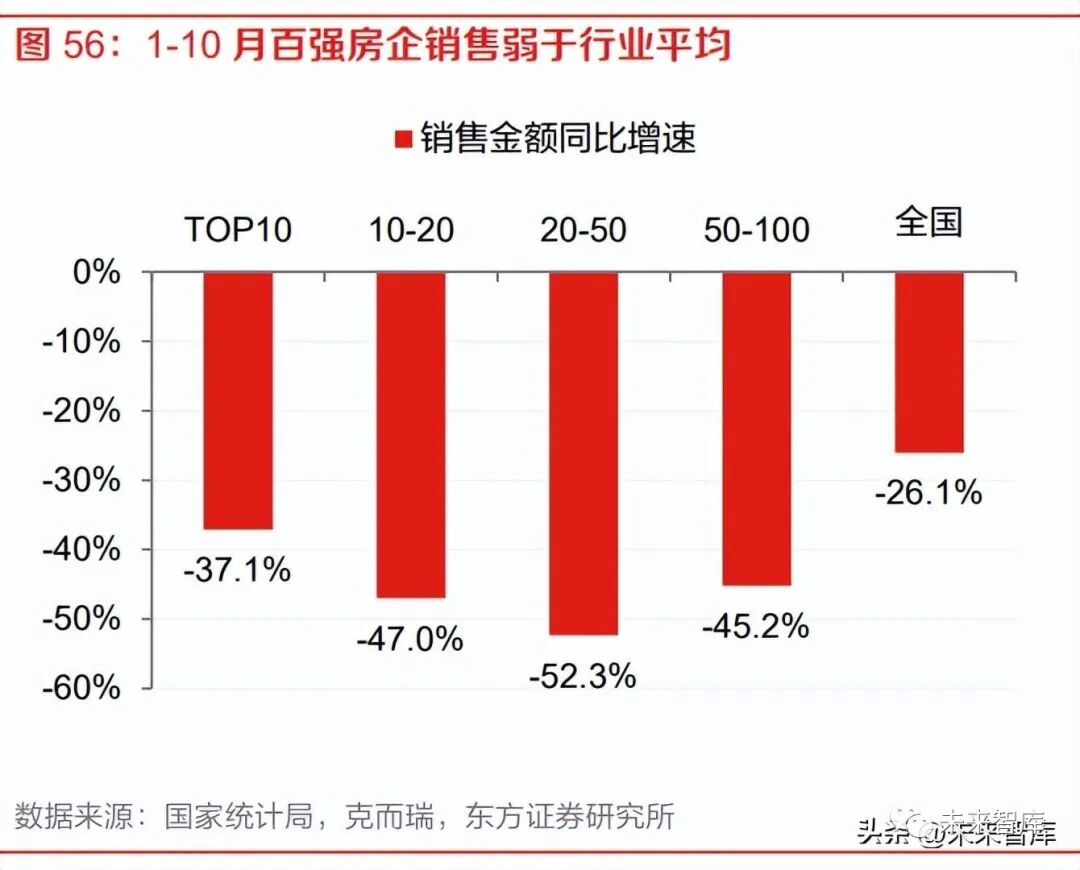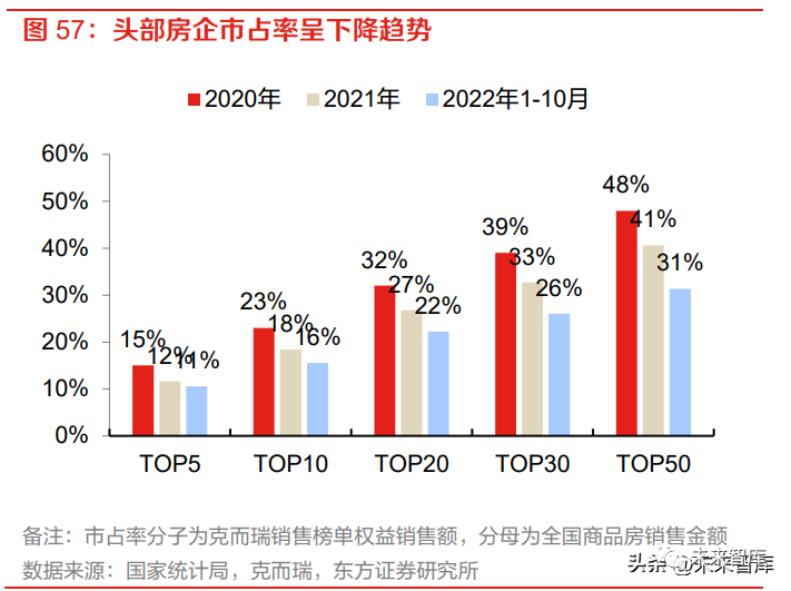 全国化扩张的激进民企出险后,行业集中度持续下降,头部央企市占率阶段性提升,本地国企有 望获得市场份额增长。2022 年 1-10 月 TOP10、TOP10-20、TOP20-50、TOP50-100 房企销售 金额的同比增速分别为-37.1%、-47.0%、-52.3%和-45.2%。1-10 月 TOP10 销售集中度下降至 15.6%。可以看到全国层面整体的销售下滑幅度小于百强数据以及龙头房企的数据,除去统计口 径的差异外,可能是去年下半年以来市场下行,部分地方中小企业承接了出险房企的市场份额。结合拿地表现来看,我们认为具备融资优势、拿地优势、交付信用优势的头部央企将在市占率上 阶段性占优,而深耕本地、拿地成本占优的本地国企有望迎来市场份额的进一步提升。