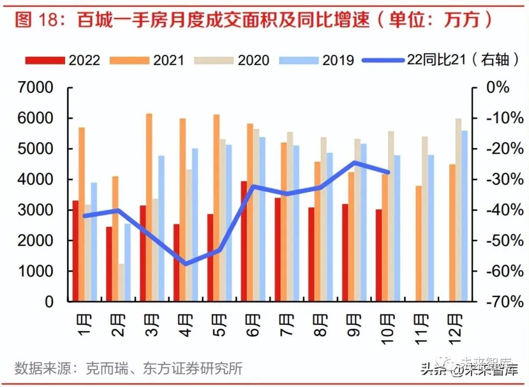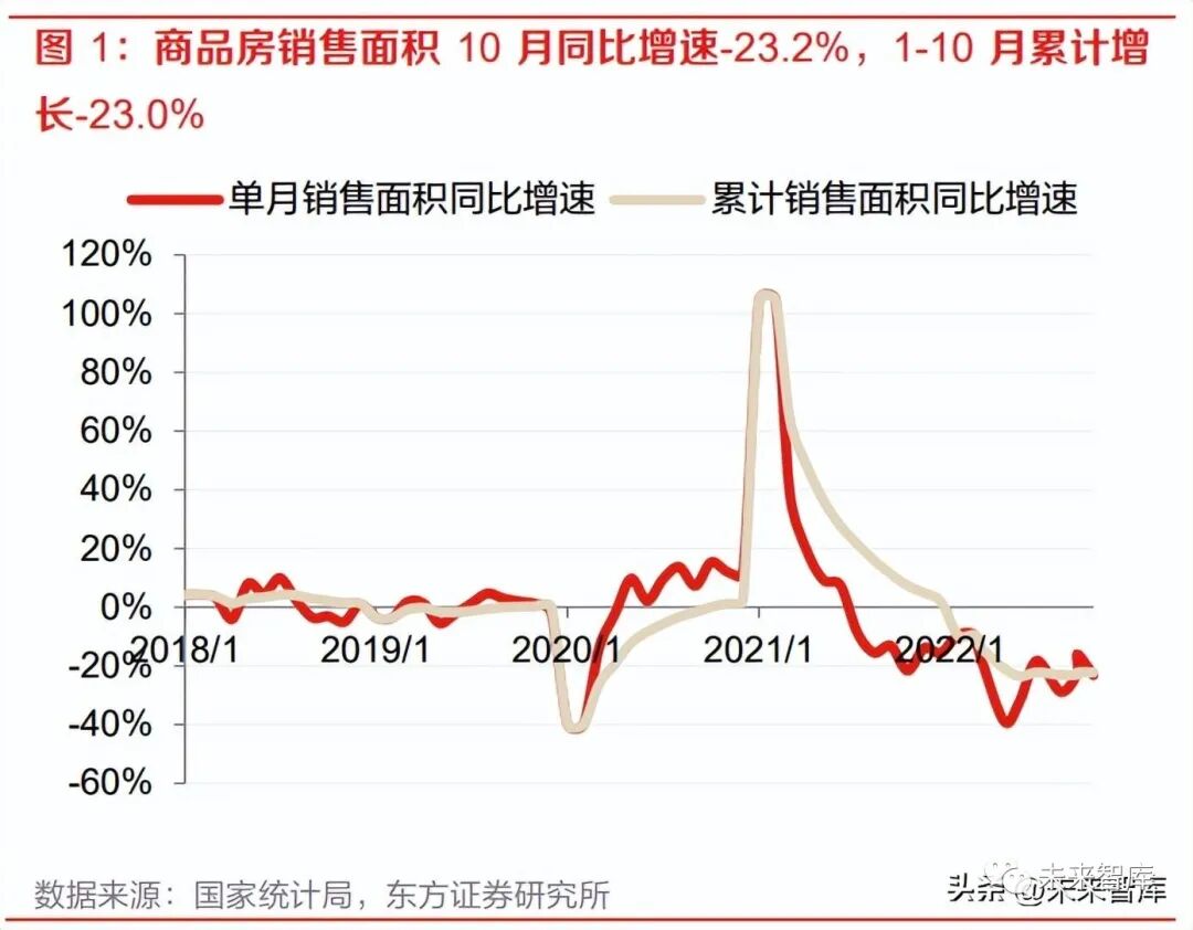 市场延续 2021 年下半年以来的调整趋势,磨底期尚未结束。2022 年 1-10 月,全国商品房销售面 积累计同比增速-22.3%,下半年以来在去年同期低基数下单月及累计同比降幅持续收窄,但从绝 对量来看,在不考虑 1-2 月春节假期因素的情况下,前 10 月中有 4 个月(包括 7-8 月连续两个 月)单月销售面积不足 1 万方,系 2015 年以来首次。6 月、9 月单月销售面积同比降幅出现两次 较为明显的收窄,我们认为主要与几个因素有关:①此前局部疫情导致的需求递延;②部分头部 房企半年末/季度末集中推货。