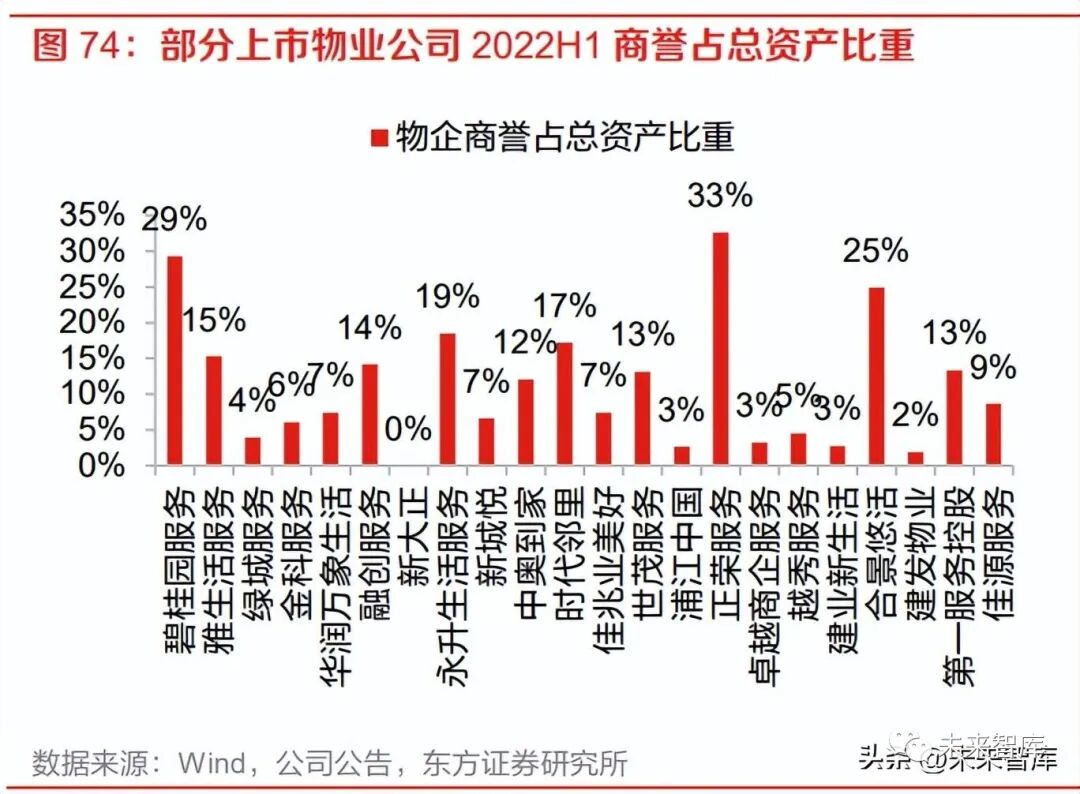 应收账款减值风险未被完全消化。从 2022 年中报来看,上市物业公司平均应收账款周转天数为 98.5 天,较 2021 年的 69.1 天有较大提升。从个体公司来看,非业主增值服务收入占比越高,除 央国企外的物业公司应收账款周转天数一般越长,可以认为关联方拖欠相关款项是影响物业公司 应收款项的主要原因。部分物企 2022H1 对关联方应收账款计提大额减值,对业绩形成较大冲击, 但仍未完全减值完毕。收并购带来的大额商誉同样增长了物企后续业绩的不确定性。部分物企前期收并购力度较大,商 誉占比较高,目前尚未观察到大规模的商誉减值,如收并购标的业绩不及预期,后续出现减值, 业绩增长仍具不确定性。物企与关联方的独立性也是决定估值水平的重要因素。