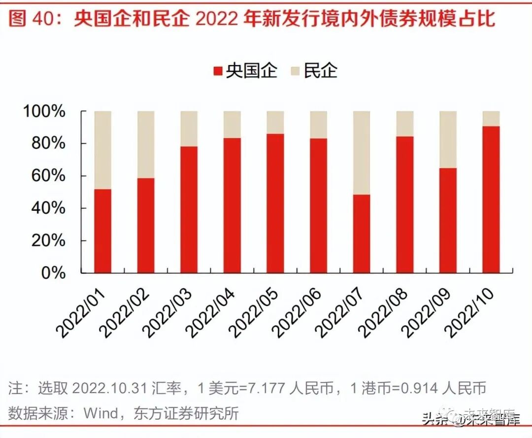 民企融资难度更大,央国企具备融资优势。从债券融资结构上看,今年 1-10 月央国企新发行境内 债+境外债规模 4211 亿元,占比 71.3%,民企新发行境内外债券规模 1691 亿元,占比 28.7%。从净融资额上看,央国企 1-10 月境内债+境外债测算净融资额为 957 亿元,而民企境内外债券测 算净融资额为-4198 亿元。5 月以来政策性机构多次为优质民营房企融资提供增信支持,对民企单 月债券融资净流出有一定缓解,但民企销售复苏弱于行业,央国企的相对融资优势仍在扩大。
