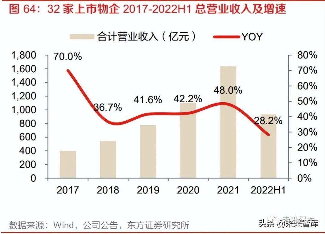 基础服务增长稳健,增值服务受到较大冲击。样本上市公司 2022H1 基础物管/商管/社区增值/非 业 主 增 值 服 务 同 比 增 速 分 别 为 39.3%/25.8%/16.2%/-2.9% , 2021 年 同 比 增 速 分 别 为 39.8%/39.0%/68.3%/36.7%,基础服务营收增长相对稳健,增值服务增速下调明显。非业主增值 服务主要是物业公司为开发商销售阶段提供的协销等后勤服务,过去关联方在非业主增值服务领 域对物业公司的支持力度较大,在地产下行的背景下,这部分业务未来将丧失成长性。社区增值 服务营收不确定性主要来源于疫情反复和房地产经纪等地产相关业务的影响。