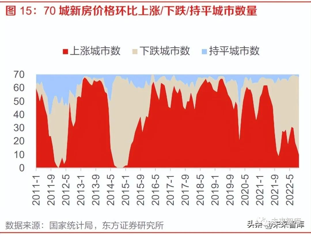而从克而瑞监测的百城销售数据来看,10月百城成交面积再度下探, 同比降幅近 3 成,“金九银十”不再,市场持续磨底,也反映出此前政策托底效果一般。价格方 面,70 城新建商品住宅价格指数自 2022 年 4 月以来同比连续 6 个月下跌,10 月同比下跌 2.4%, 跌幅持续加深;环比自 2021 年 9 月以来连续 14 个月持平或下跌(仅 2022 年 1 月环比持平),6 月以来跌幅扩大,同时环比下跌城市数量增多。以领先指标二手房指标来看,70 城二手住宅价格 指数同比连续 9 个月下跌、跌幅加深,环比连续 15 个月持平或下跌、7 月以来跌幅加深。整体而 言房价下行压力仍未看到扭转趋势。