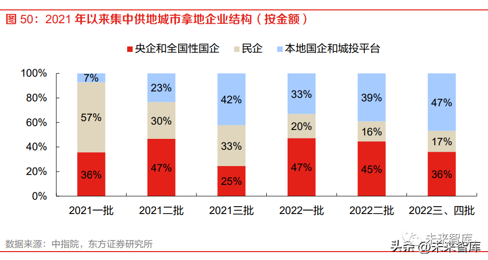 央企和全国性房企阶段性发力,本地国企和城投平台托底成为常态。2022 年以来拿地企业发生结 构性变化:1)资金优势明显的大型央国企在重点城市明显发力,拿地金额占比超过四成。随着 市场无明显起色,投资有所放缓;2)民企成交金额占比不足两成,仅滨江等地域优势明显的民 营企业于深耕城市保持较高拿地力度;3)随着央国企布局放缓及民企持续乏力,本地国企及城 投平台的托底作用更加重要,拿地金额占比逐步提升。但从楼板价上看,城投平台成交地块的平 均楼板价明显低于所有地块均值。分批次来看,随着行业基本面无明显好转,各城本地国企和城 投平台拿地占比进一步提升,地块入市后预计市占率将有所提高。