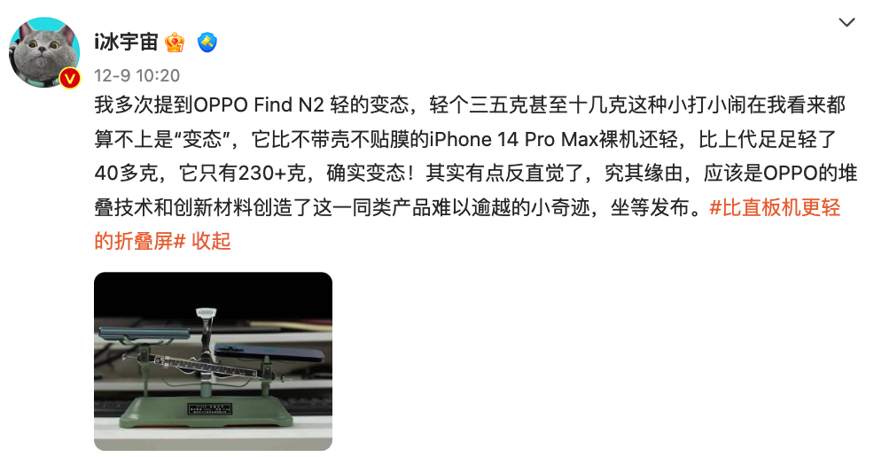 近日,OPPO官方发布消息表示,“OPPO未来科技大会2022,致善 · 三生万物,12月14日-15日与大家共同见证,OPPO最新技术战略与Find N2系列新品发布。”按照OPPO官方公布的信息来看,OPPO第二颗自研芯片将于12月14日正式发布,新一代的OPPO Find N2系列折叠屏旗舰则将于12月15日到来。关于即将到来的OPPO新一代折叠屏产品,官方信息显示,其将包括 Find N2 和 OPPO 首款竖向折叠旗舰 Find N2 Flip。OPPO 高级副总裁、首席产品官刘作虎在相关的剧透中提到,“对比上一代铰链,这次不是升级而是进化,更轻,更强,更窄!小折叠用的也是不同尺寸的同款铰链”。就此来看,即将到来的OPPO Find N2系列折叠屏旗舰将会进行铰链升级,这有望对整机重量和厚度表现进行提升。在最新的预热中,OPPO还展示了Find N2 Flip的外观设计信息。结合预热图片来看,这款上下翻折旗舰的整体设计与主流方案一致,都是类似于翻盖手机的设计,但外部的副屏部分采用了不同的方案。OPPO Find N2 Flip在机身外部配备了一块大尺寸副屏。与市面上的部分同品类产品相比,这块屏幕似乎更大一些。这应该会使其支持更多的应用操作,带来更便捷的使用体验。同时,作为 OPPO 首款竖向折叠产品,Find N2 Flip 将大幅提升续航、折痕、信号等基础体验,提供丰富的交互功能,提升竖向折叠屏手机的实用性。在同一场活动中,OPPO还将带来横向翻折的Find N2新机。据称,Find N2采用创新材料并重构关键结构件,带来折叠屏重量上的重大突破,并全面升级屏幕、影像、性能及悬停体验,带来“超越直板手机的体验”。与此同时,官方预热中提到,OPPO Find N2“比直板机更轻”“期待一下,这次 Find N2 会刷新折叠机最轻记录,甚至比___还轻”等信息。结合来看,新一代的OPPO横向折叠旗舰似乎会带来更进一步的重量升级。而来自博主@i冰宇宙 的爆料也曾提到,“它比不带壳不贴膜的iPhone 14 Pro Max裸机还轻,比上代足足轻了40多克,它只有230+克”。与之对比,小米MIX Fold2重262g,三星 Galaxy Z Fold 4 整机重263g;华为Mate Xs 2整机重255g,但其采用了外折设计,不需要外部副屏。如果最新爆料中提到的OPPO Find N2机身重量信息最终可以实现的话,那么不到240g的折叠屏设备应该会吸引到不少用户的关注。对于折叠屏手机来说,较之传统设备更重的整机重量是令不少用户犹豫是否购买的原因之一。如果能将折叠屏设备的整机重量降至与传统设备接近,那应该会消除更多的用户顾虑,促进销量。综合目前的消息来看,虽然OPPO即将推出的两款折叠屏新品都是目前大家比较熟悉的品类,但似乎都进行了新的调整,带来了不同的主打亮点。这也令人更加期待这两款新机的到来。