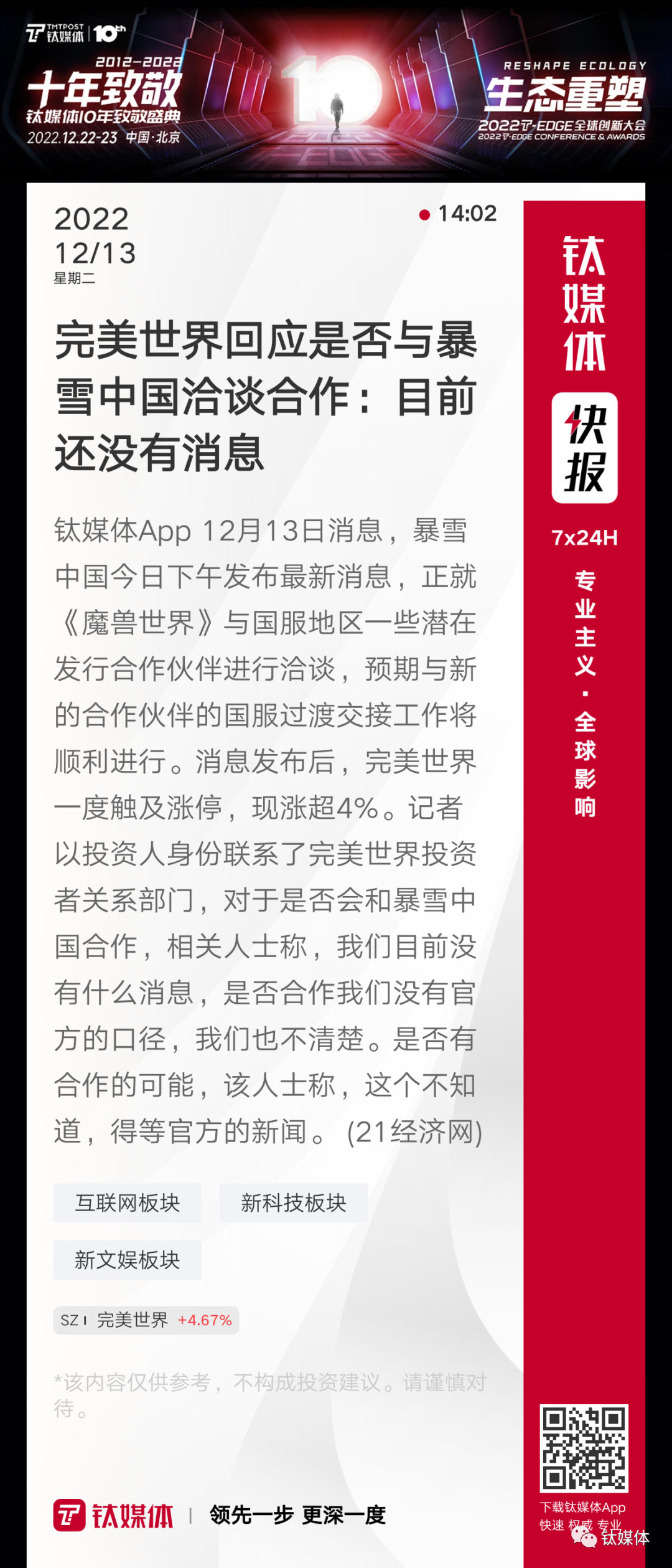 【完美世界回应是否与暴雪中国洽谈合作:目前还没有消息】