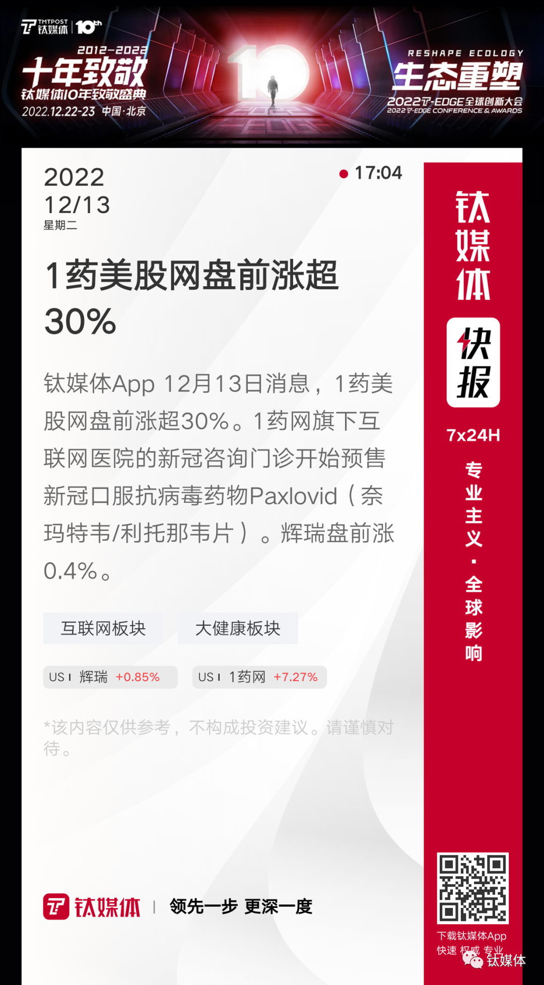 【1药美股网盘前涨超30%】