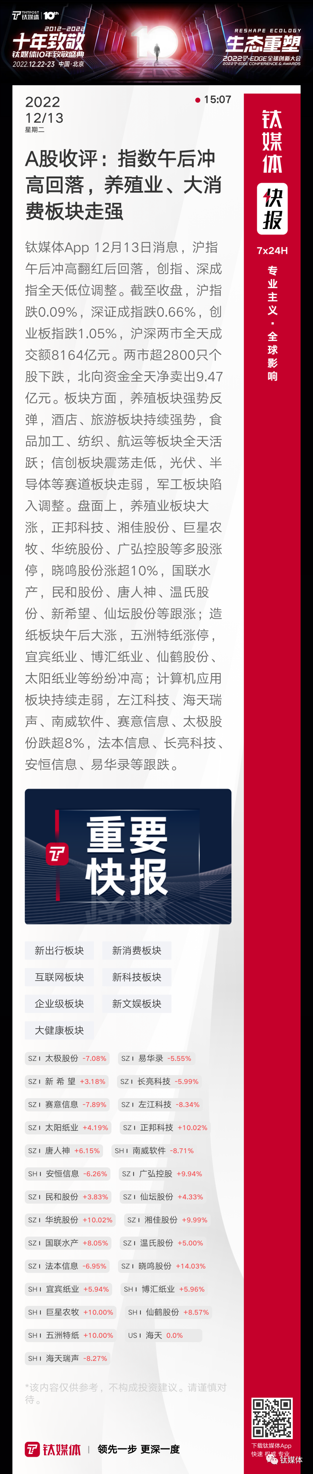 【A股收评:指数午后冲高回落,养殖业、大消费板块走强】