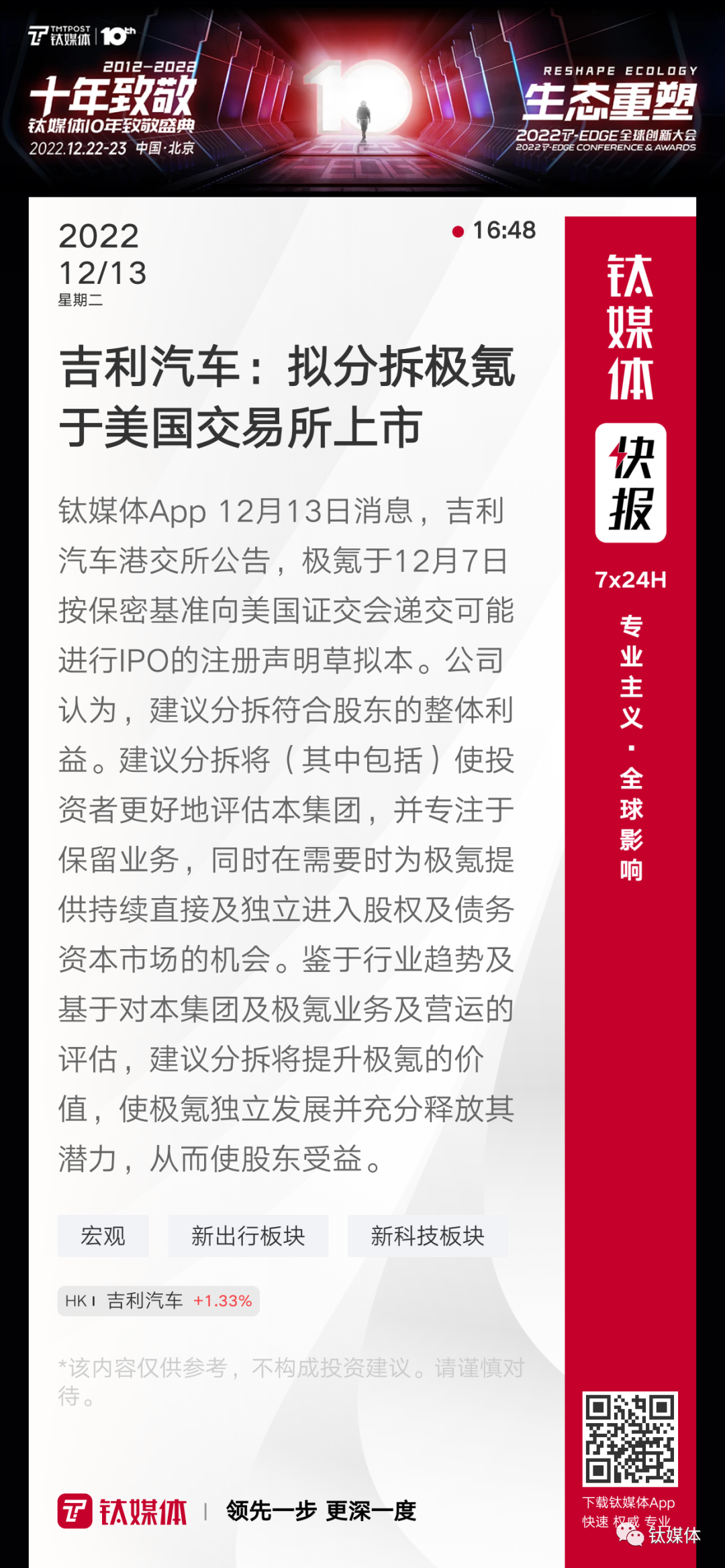 【吉利汽车:拟分拆极氪于美国交易所上市】
