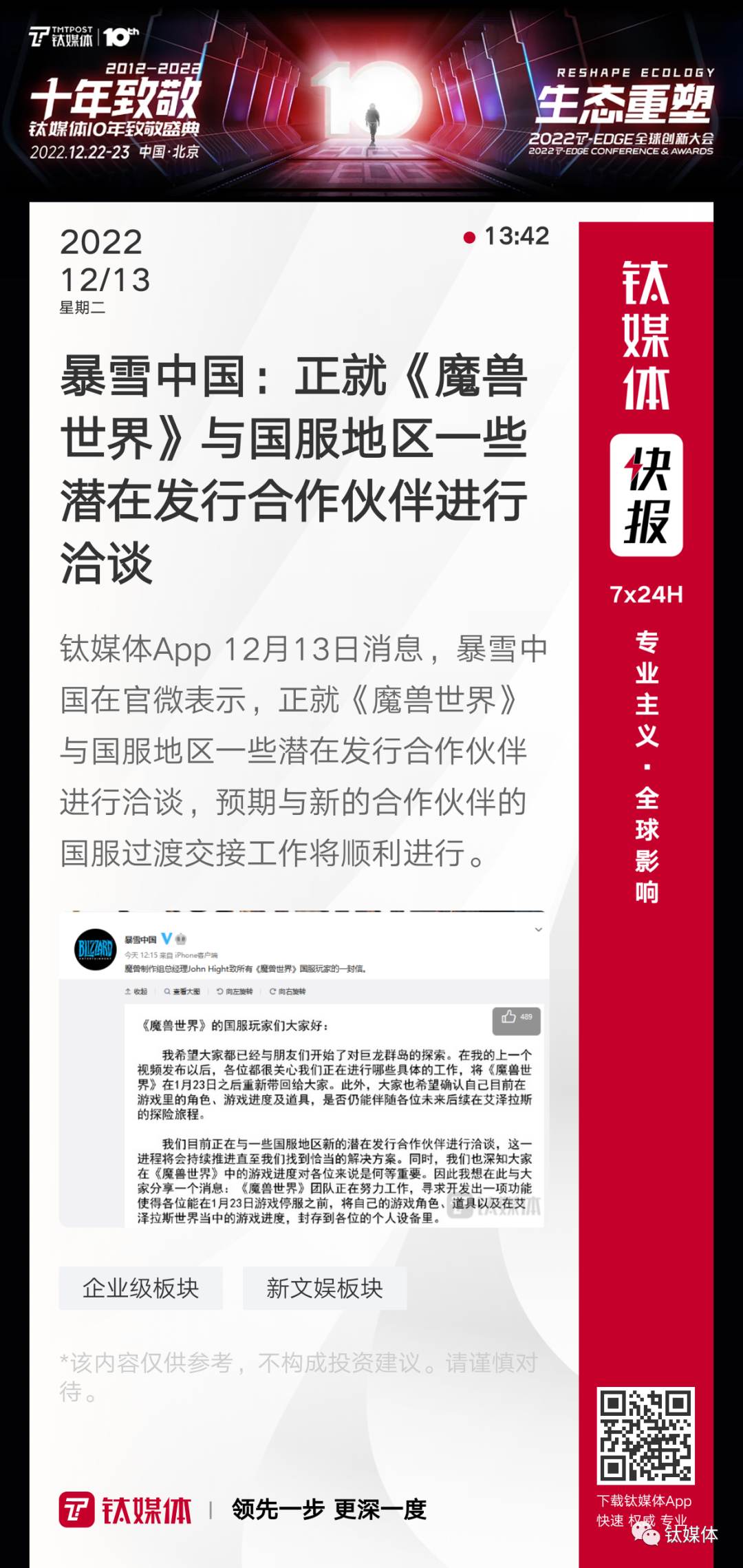 【暴雪中国:正就《魔兽世界》与国服地区一些潜在发行合作伙伴进行洽谈】