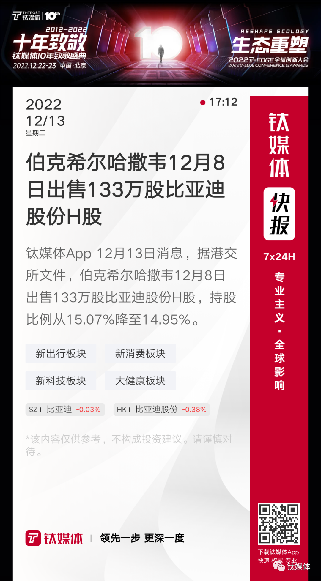 【伯克希尔哈撒韦12月8日出售133万股比亚迪股份H股】