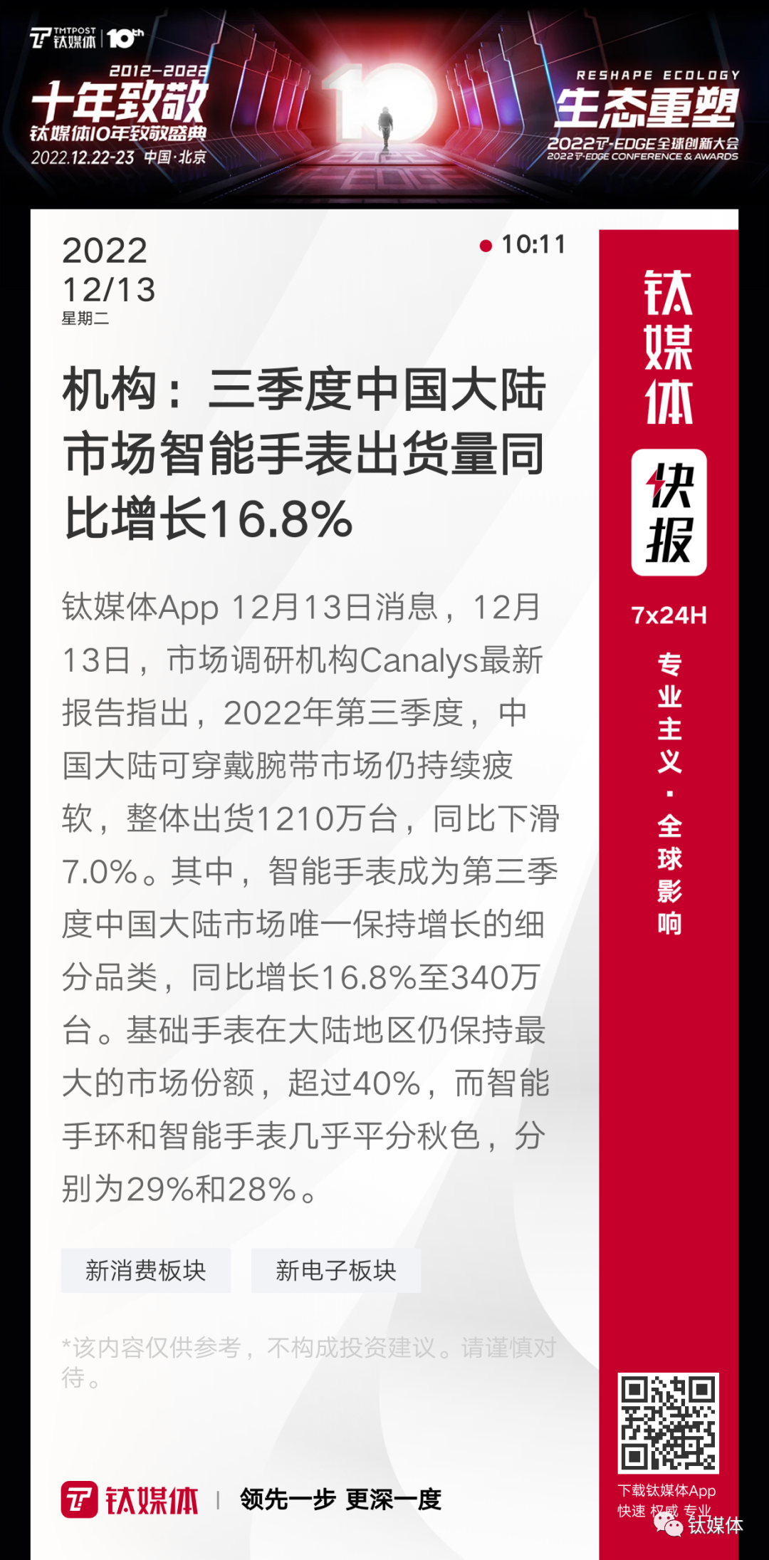 【机构:三季度中国大陆市场智能手表出货量同比增长16.8%】
