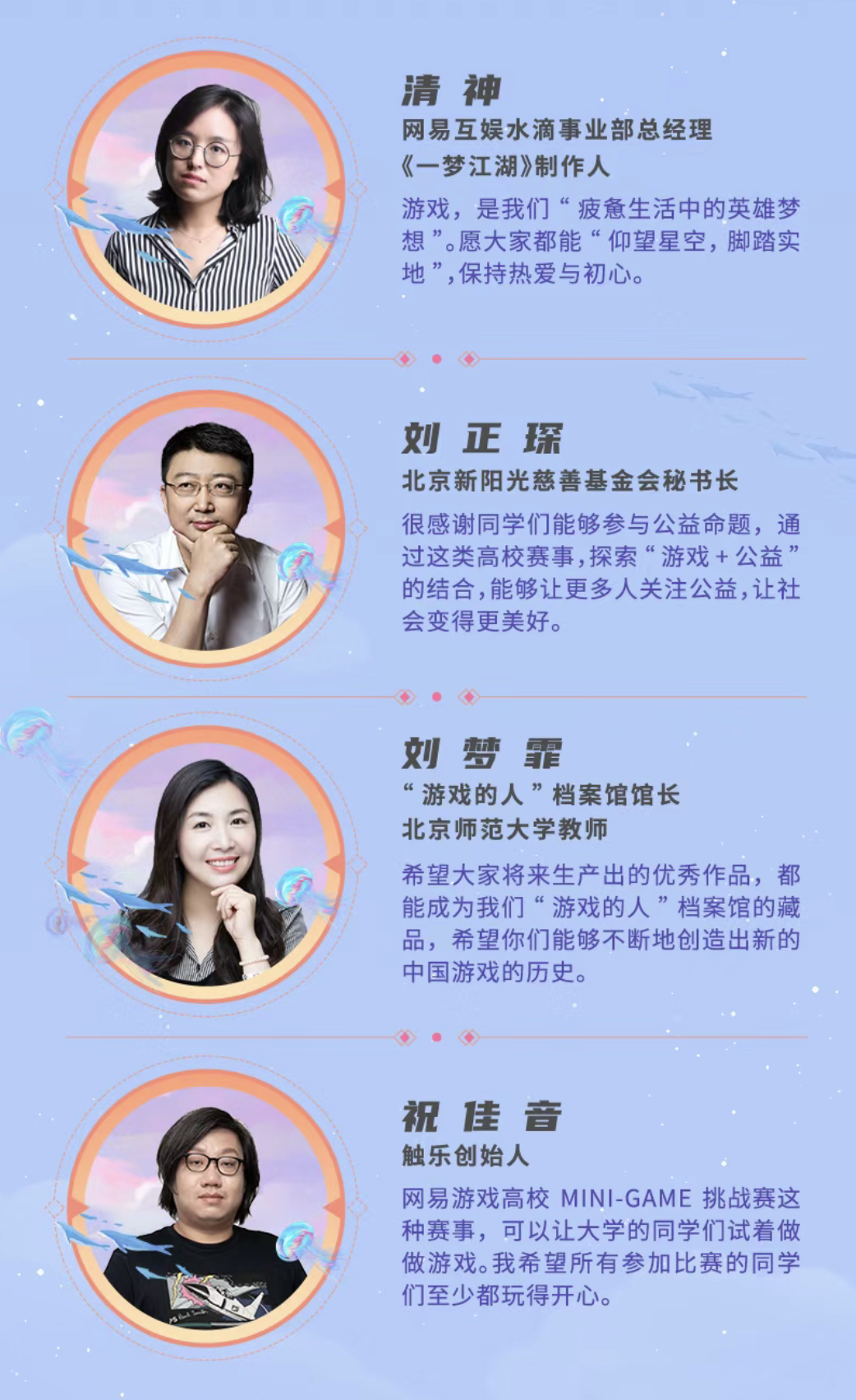 如网易互娱水滴事业部负责人总经理、《一梦江湖》制作人清神在颁奖致辞所说,今年的获奖作品融入了高校学子对传统文化、社会热点和责任价值的多维度思考。实际上,网易游戏高校 MINI-GAME 挑战赛一方面为参赛者提供逐梦的舞台,另一方面则通过持续拓展游戏边界,实现游戏与社会效益的紧密融合,为高校学子的未来发展中注入了正向的精神力量。评审北京大学兼职副教授、全球独立游戏发行商Devolver Digital亚太区副总裁张国祥勉励参赛者,从游戏研发的乐趣中找到人生的真谛。游戏产业媒体触乐网创始人祝佳音则肯定了高校 MG 赛事对大学生的价值,并祝福所有参赛者能够获得实战经验,不断推动行业发展。