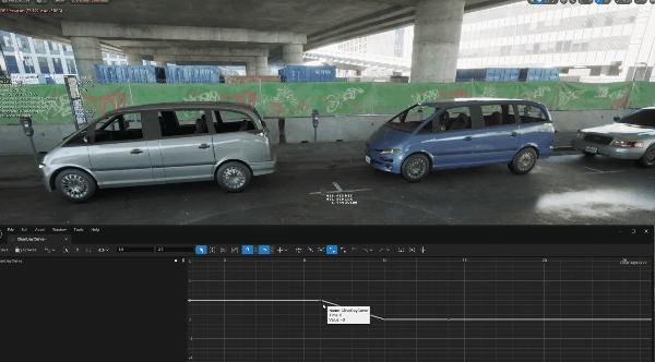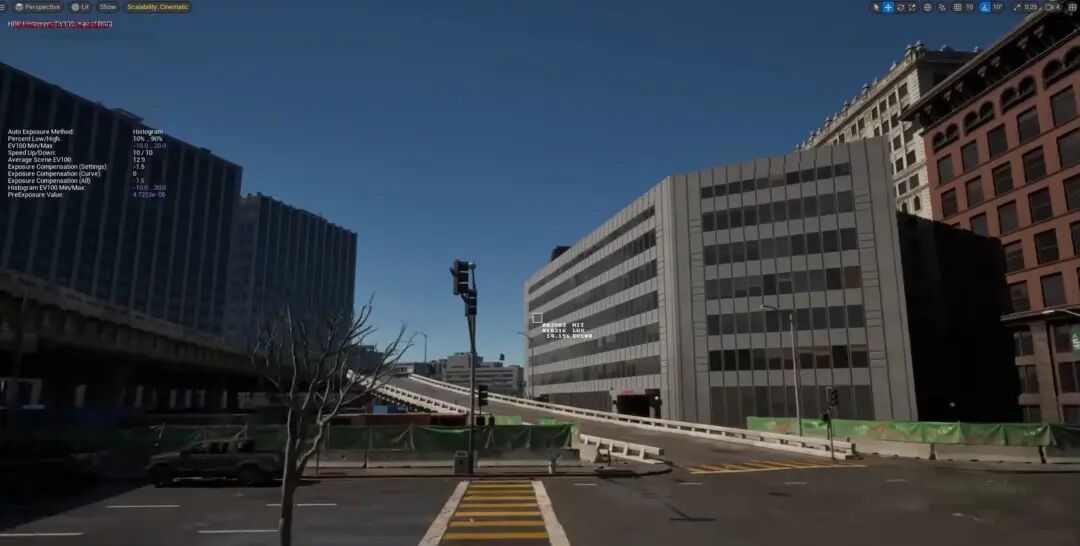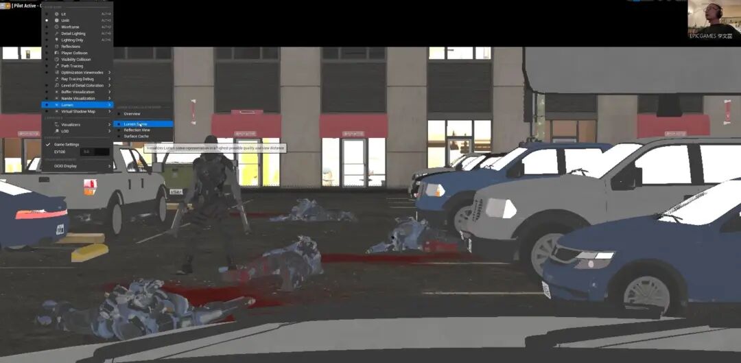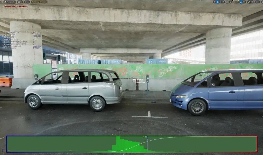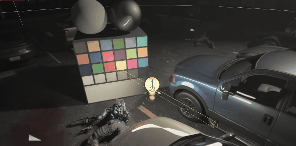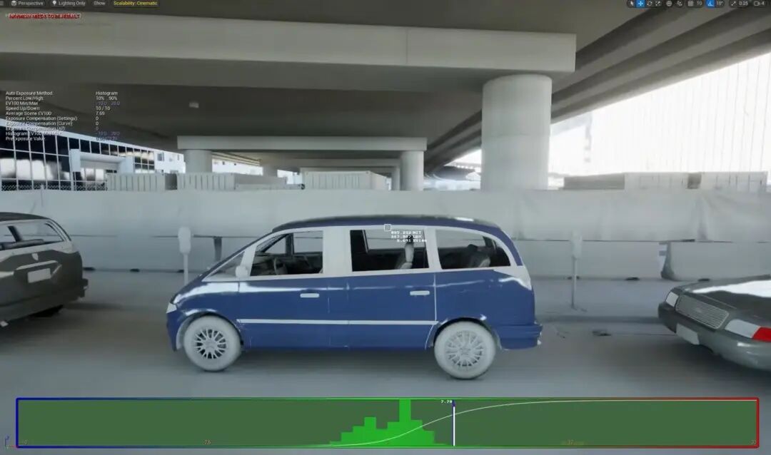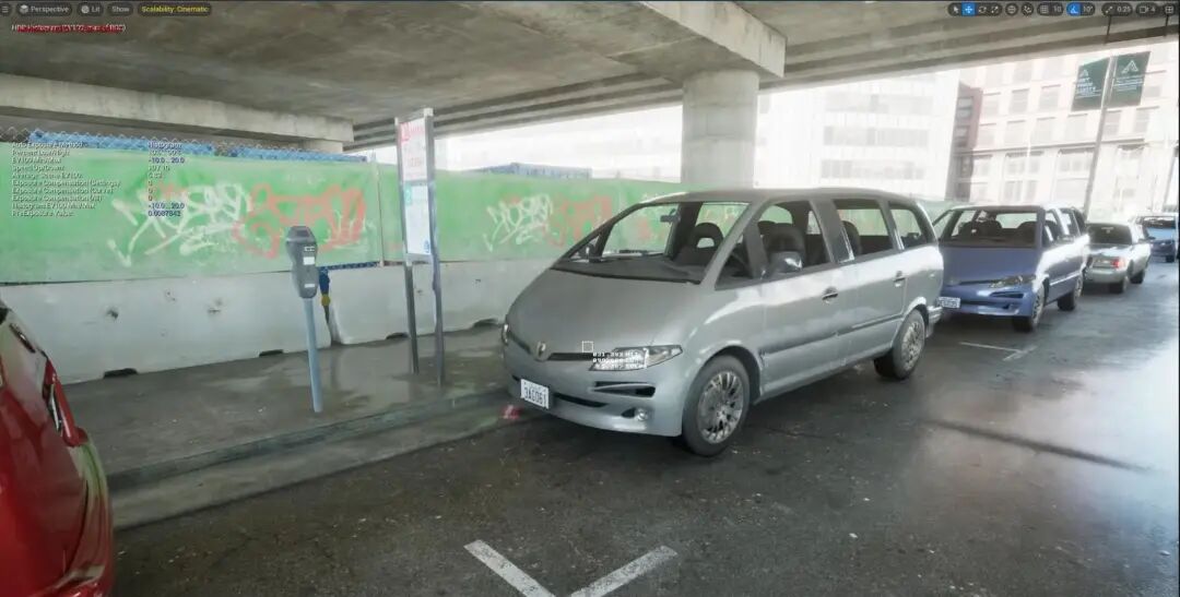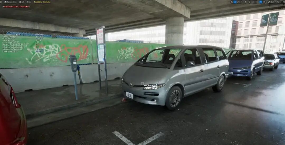 大家也可以看Lumen Scene当中,一个是因为角色都是骨骼物体、并不贡献GI,汽车金属性比较高,因此GI的反弹也很弱。还有,这是个室外大空间,因此GI的反弹也相对比较弱,以致于对比过于强烈,视觉效果并不友好。