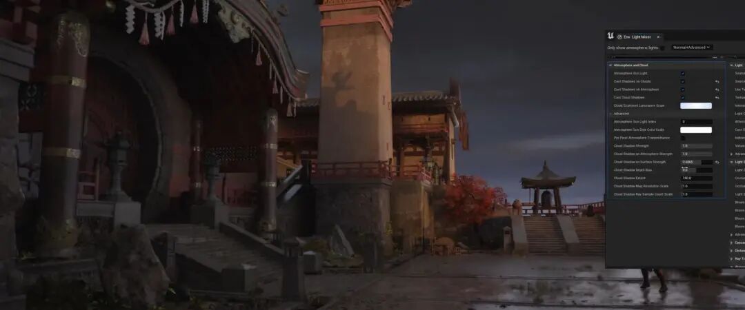 另外我们也可以通过控制米氏散射的Exponential Distribution,也就是在高度上的表现、分布的规律来控制雾的表现,更加在地平线附近模拟晨雾还是整个空间。同时,如果当我们的光比较低的时候,比如说这边光线非常低的时候,也会对光线的遮挡产生非常大的影响。