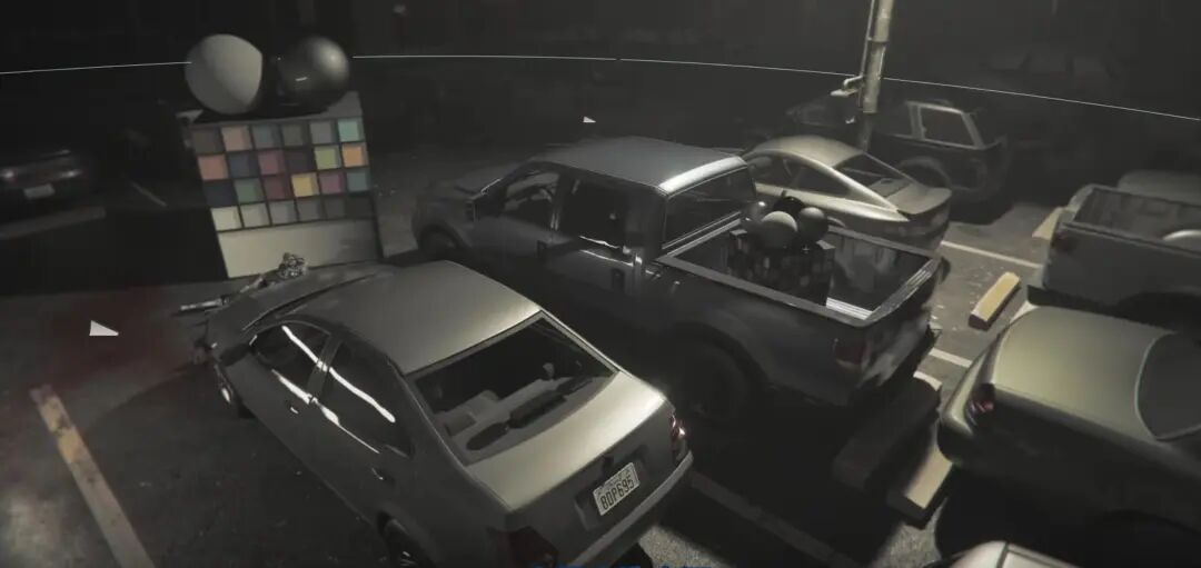 这个时候如果加入一个高显色性的主光源,不仅在亮度上,也可以在饱和度上产生对比,更加突出主体。比如这个主光源是用来照明角色,可以观察色板以及汽车的颜色,在灯光下更加饱和和艳丽。