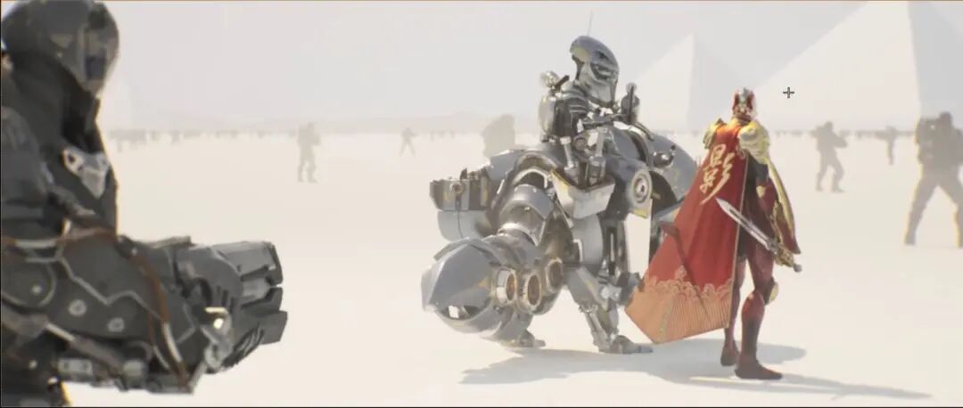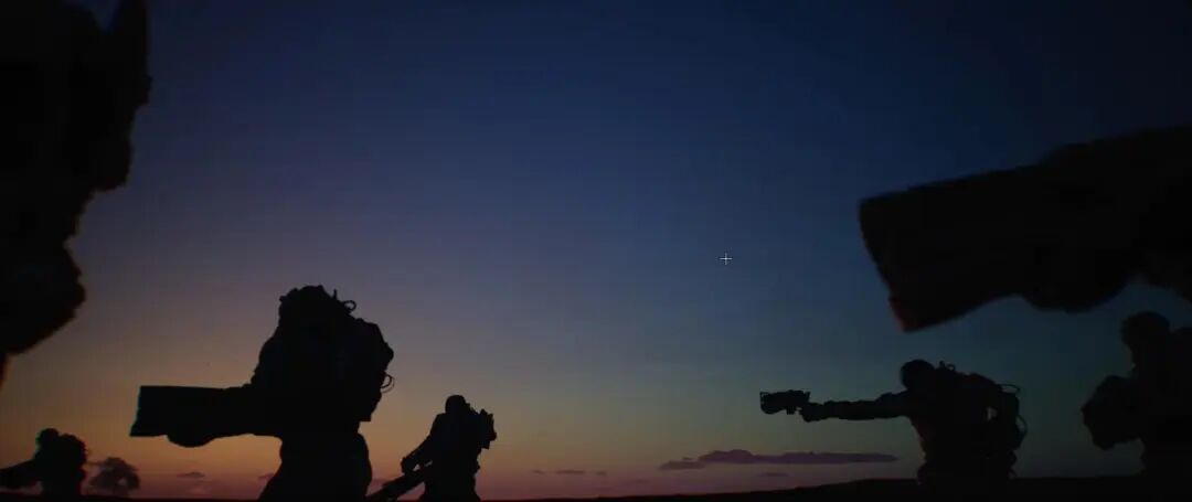 这个镜头的情节大概是表现一列队伍在黄昏的时刻,悄悄地、小心地项目表行进的一个过程,调子上就使用了比较暗的低调加上高对比来表现当时的气氛。具体实现,一个是太阳用了12万Lux的亮度,符合物理,现实当中,即使是黄昏,太阳的照度还是非常高的,向光面能达到12个EV,所以暗的低调的表达主要来自,一个是利用了逆光、另一个就是欠曝光。