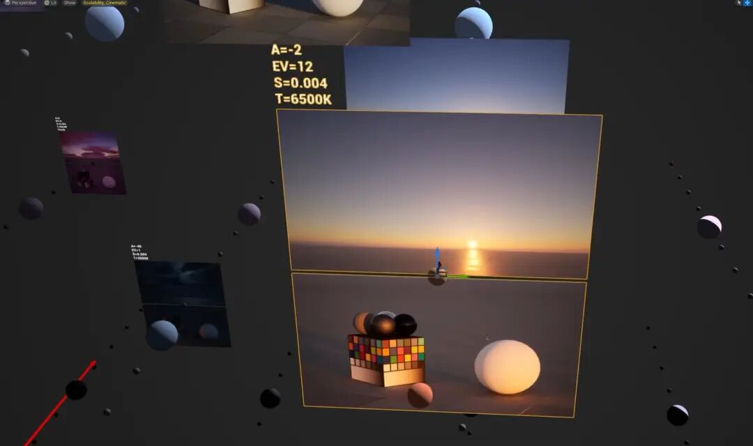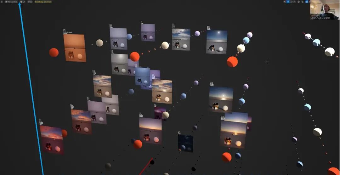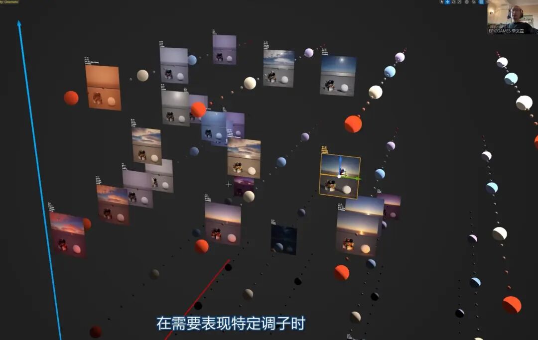 要确定一个调子,我认为首当其冲的就是要确定时间和天气,因为符合时间规律来定调是最自然和有效的方式。这里我利用UE的天空大气系统生成了一系列的调子,根据太阳不同的角度、是否有云、是否有雾,以及色温或者曝光的强弱等参数生成了一些调子,以及这些在整个调子集合当中的位置。