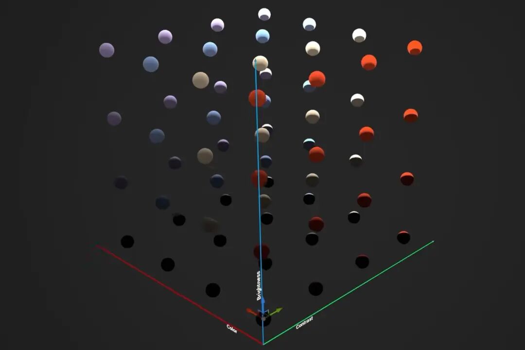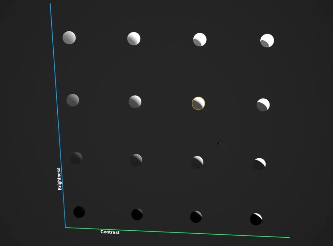 如果把这三个因素用一个坐标系内来表达,这里在二维空间中,横坐标是对比度,纵坐标是亮度,大家可以看到,从左下到右上对比加强,亮度变亮,即从低调低对比往高调高对比过渡。