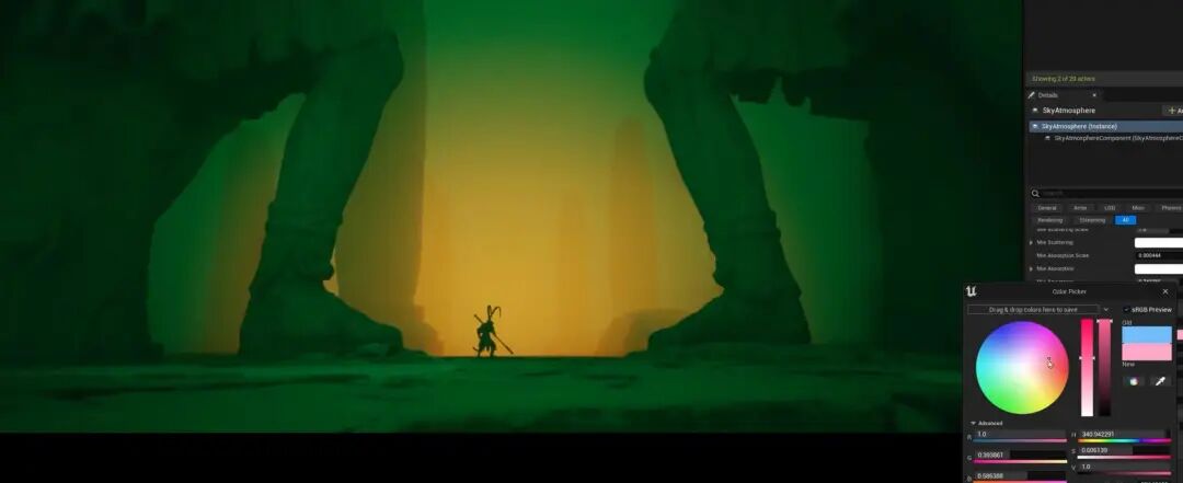 色彩的表现主要选择了黄昏这个时间,Magic Time,这个时间的光色变化非常的快,也非常丰富。大家可以观察在地平线附近的红色、橙色、到变化到黄色,以及这里边有一抹淡淡的绿色,还有这边的紫色,再到深空的深蓝色。所有这些色彩的产生和表现都已经在引擎自带的天空大气这个系统里面能够实现,但这边也要配合白平衡。