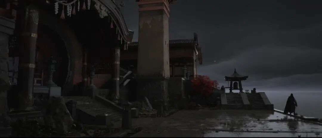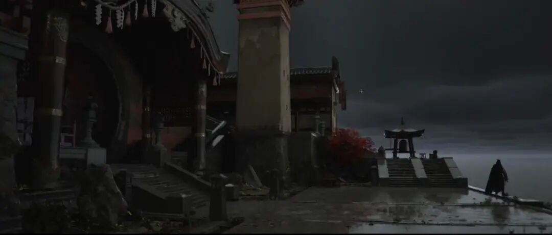 从体积雾我们就可以察觉出这个光源的位置、衰减的范围,它的强度颜色等等,另外同时开了一个比较重的暗角,在广角的镜头当中或者这个构图中,可以加重暗角,这也符合成像原理。暗角加上这个中心的体积雾光效,强调了事实光源和构图,也帮助推进了情节,因为在情节上看,也许接下去就是往这个迷雾中心深入前进。