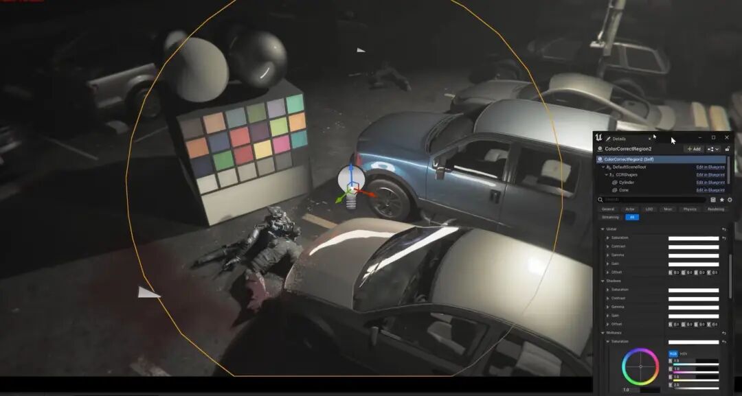 这边的实现是通过添加一个区域后期,调整它的饱和度,主要是亮部以及中部的饱和度增强,来增强这个光周围的饱和度。当然,前提是我们需要打开叫做Color Correct Regions的插件,这种方式对于拍片子或做动画更加精细的对色彩控制,可以作为一个参考。