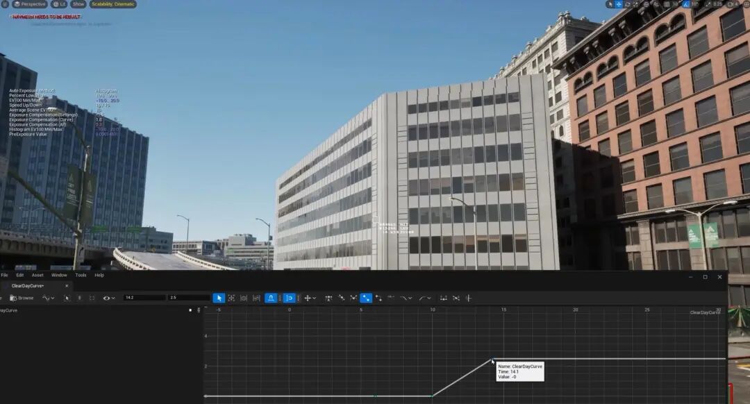 但是在一些区域,我屏幕当中的像素或固有色并不是特别暗的情况下就会产生欠曝,这个时候就可以利用曝光曲线根据不同的EV进行调整。这边我先给了三个点,覆盖了从最低的6EV到14EV的范围,然后在这个14EV的环境下,对它进行一些曝光增强处理,甚至可以有一点过曝,达到我需要的一个高调的效果。