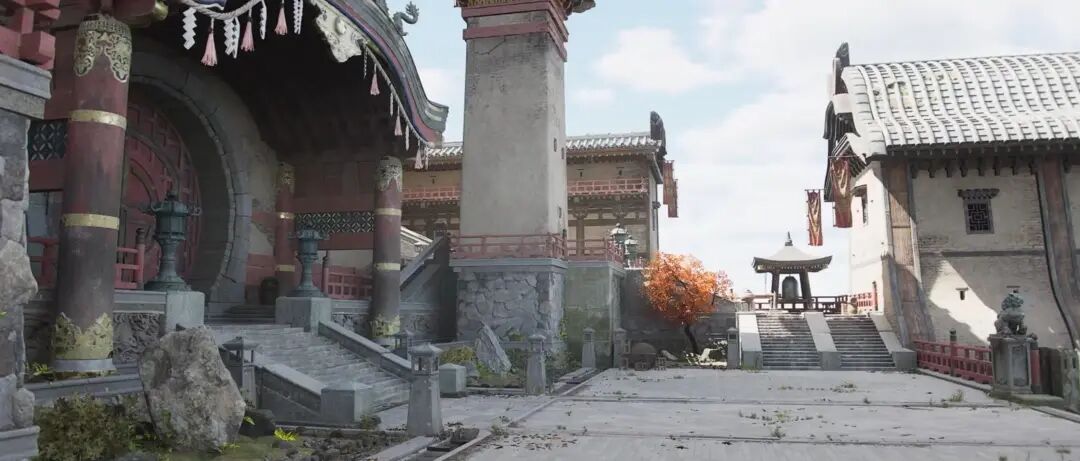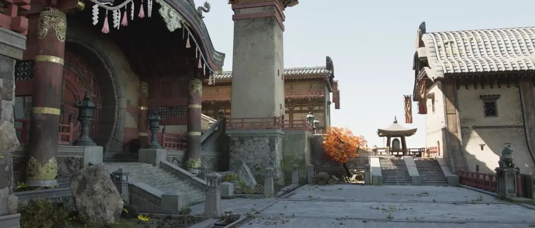 太阳角度是比较垂直的,大家可以观察阴影是比较短的,虽然是一个侧光,但是视口内有大面积的向光面朝向摄像机。这里通过适当的过曝能够产生一种烈日灼日的感觉,这种光线的角度有比较强烈的一次性反弹,对于暗部的一些细节层次刻画比较有利,尤其是固有色有比较多的色彩丰富的时候,会产生比较好的反弹效果。