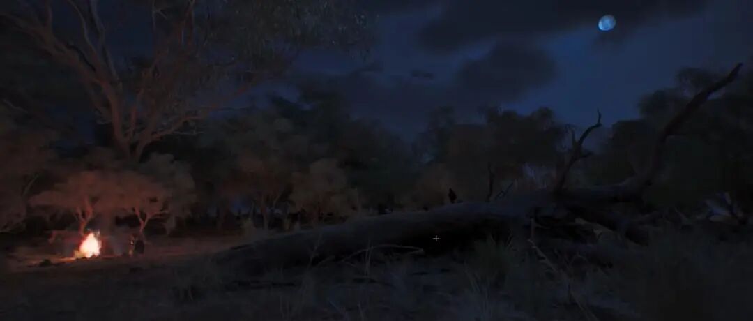 这里色彩完全来自自然光色,没有做任何后期的校色。首先太阳角度比较低,本身颜色非常暖,环境光因为角度低产生的瑞利散射和米氏散射对颜色变化比较动态,然后在后期中使用了4500的色温让它更加偏蓝紫。