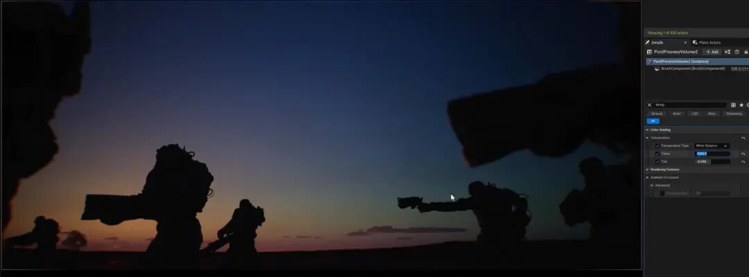 Lumen使用了硬件的光线追踪,这是因为骨骼的物体在硬件光线追踪有更好的阴影遮蔽和反射。后期也少许提亮了暗部的一些亮度,来保证画面没有纯黑的画面像素存在,这特别适合中低对比的画面。暖调主要来自于对色温的一个偏差,这里是7500的色温。