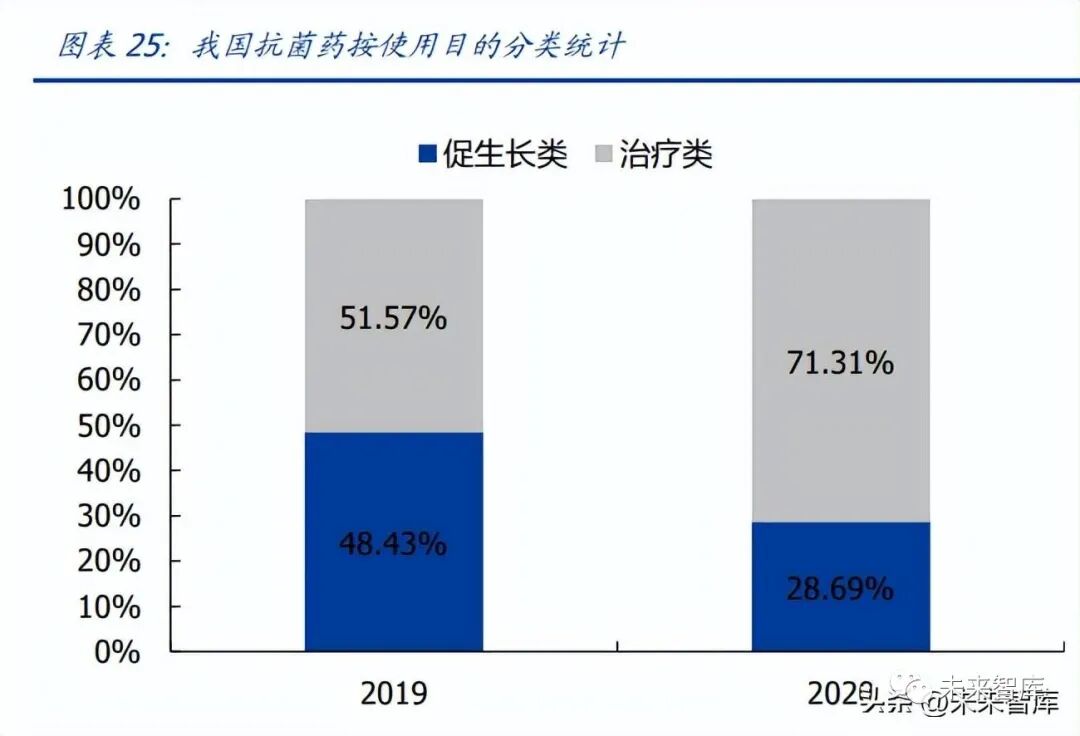 兽用化药作为养殖环节中重要的组成部分,可起到禽畜疾病预防、治疗,以及部分抗生 素可起到一定促生长作用,从而实现提升养殖效率的目的。但大量甚至滥用抗生素会产 生诸多问题,包括抗生物残留对食品安全的危害、细菌耐药性导致生物安全风险等。顺 应全球发展趋势,我国限抗、减抗相关文件政策逐步出台,2015 年发布《遏制细菌耐 药国家行动计划(2016–2020 年)》;2017 年发布《全国遏制动物源细菌耐药行动计划 (2017–2020 年)》,明确到 2020 年,推进兽用抗菌药物减量化使用;2019 年 7 月 9 日,农业农村部发布了公告第 194 号,提出饲料生产企业停止生产含有促生长类药物饲 料添加剂(中药类除外)的商品饲料,饲料端开启全面禁抗。