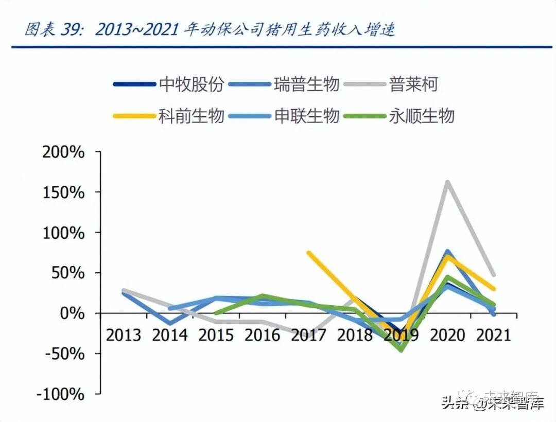 从股价表现看,板块性行情基本与下游生猪景气趋势相符,行情启动时点仍滞后于下游 生猪周期反转起点,我们认为核心逻辑在于下游养殖正向盈利是动保需求恢复的必要条 件,因此当生猪价格上涨至行业成本线后催化动保板块业绩转暖+β行情演绎。本轮周 期中,瑞普生物在 2019 年上半年显著跑赢行业,主要受益于肉鸡板块高景气,而公司 产品以禽用产品为主;中牧股份在 2019Q3 显著跑赢行业,主要受益于公司获得口蹄疫 O 型、A 型、亚洲Ⅰ型三价灭活疫苗生产并允许出口额资质以及口蹄疫 O 型、A 型二价 3B蛋白表位缺失灭活疫苗的新兽药证书;瑞普生物、回盛生物在 2021H1行情走势显著 强于板块,主要受益于 2020 年饲料端禁抗后治疗类化药需求高增长,支撑化药业务在 2021Q2 依然保持较高增速。