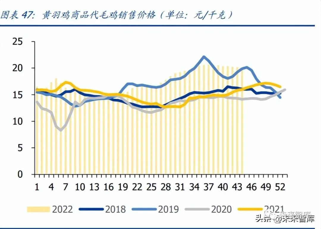 在产父母代存栏量已降至近四年最低水平附近,供给缩量支撑鸡价上涨并保持高景气。经历 2018~2019 年的产能大幅扩张,行业产能增至历史高位,2020 年 5 月起在产父母 代在行业深度亏损推动下进入去化阶段,2022Q2 在产父母代存栏环比进一步下降,目 前禽业协会存栏量维持在近 4~5 年产能水平最低位附近。且协会统计预计包含行业前 30 家企业,中小散户产能去化幅度或大于协会数据。从需求端看,由于黄鸡消费主要 来自家庭活禽热鲜以及中高端餐饮,因此 3 月以来疫情封控对黄鸡消费抑制较严重,随 疫情影响逐步减弱,需求有所恢复,供需双方支撑下鸡价自 5 月以来呈现“淡季不淡” 上涨趋势,目前仍保持历史高位。从代际传导时间看,从在产祖代到商品代出栏需要至 少十个月左右时间,因此预计供给整体偏紧行情可至少延续至 2023H1,期间鸡价行情 预计保持坚挺,且消费旺季或继续呈现阶段性上涨趋势。