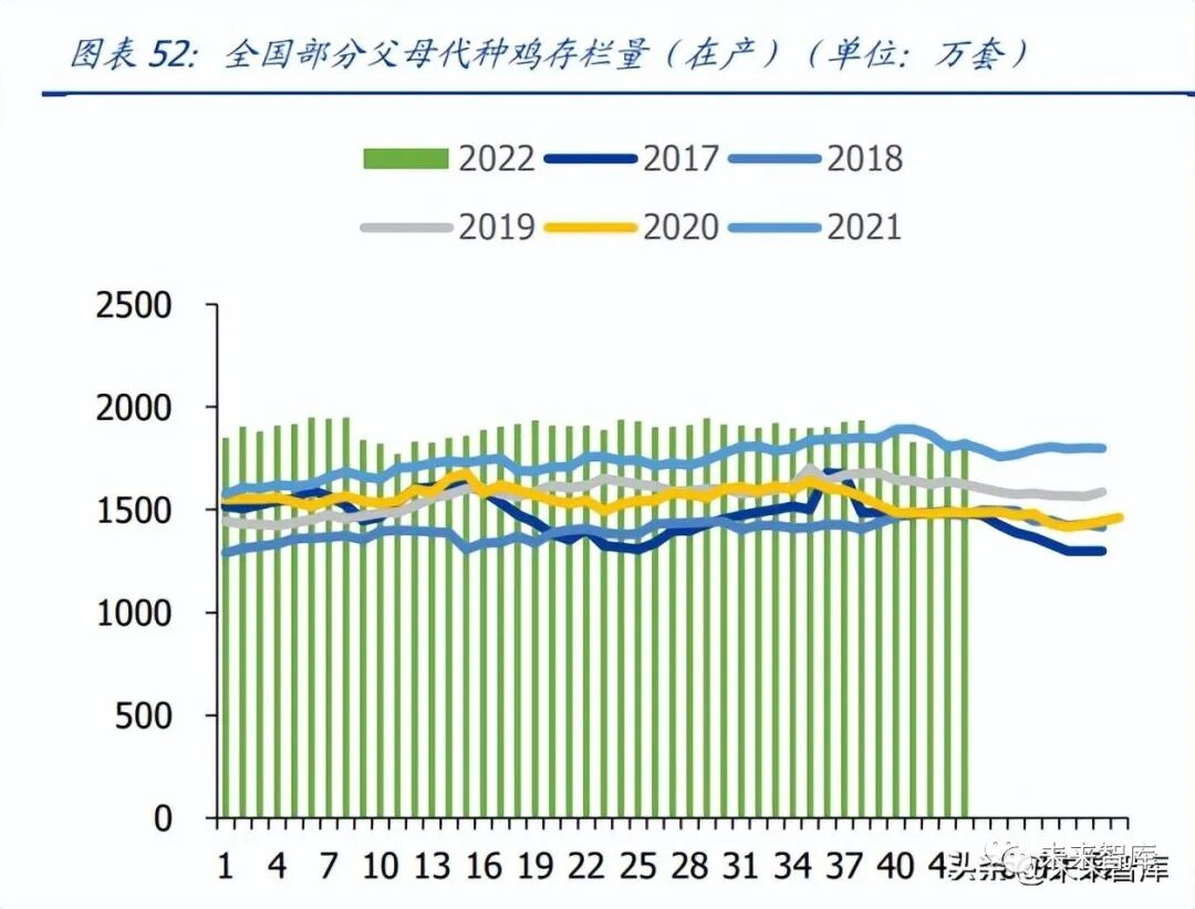 引种受限等因素背景下祖代种鸡有所去化。我国白羽鸡祖代以海外引种为主,祖代海 外引种比例预计超过 80%,主要国家包括美国、新西兰、西班牙等,2022 年 4 月底, 美国祖代引种受航班问题以及新冠疫情管控等影响,引种在 5-7 月停滞,直至 8 月初逐 步恢复,导致全国后备祖代种鸡存栏快速下降,中期看引种量受多个国家封关以及祖代 鸡健康状况多重因素影响,仍存在较大不确定性。通常在产祖代趋势滞后于后备祖代半 年左右,因此后备祖代去化在祖代环节体现或从 2022Q4 开始显著去化。