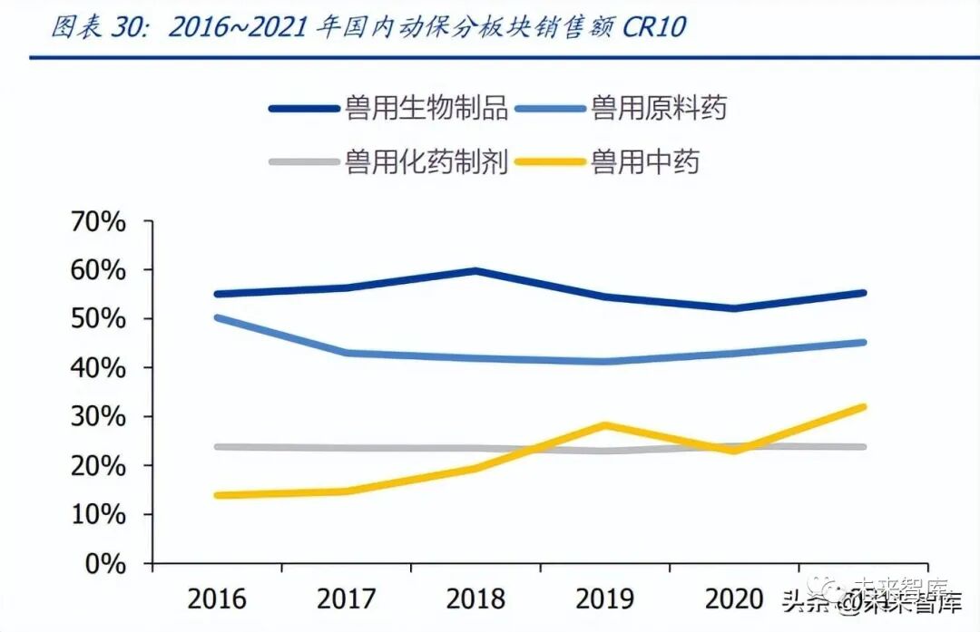 政策导向循序渐进,行业集中度已呈现逐步提升趋势。受益于政策推动下的行业规范 化程度提升、市场化发展趋势,以及从业人员素质提升,国内动保行业已逐步呈现集中 度提升趋势,2021 年兽用生物制品、兽用原料药/兽用化药制剂/兽用中药 CR10 分别为