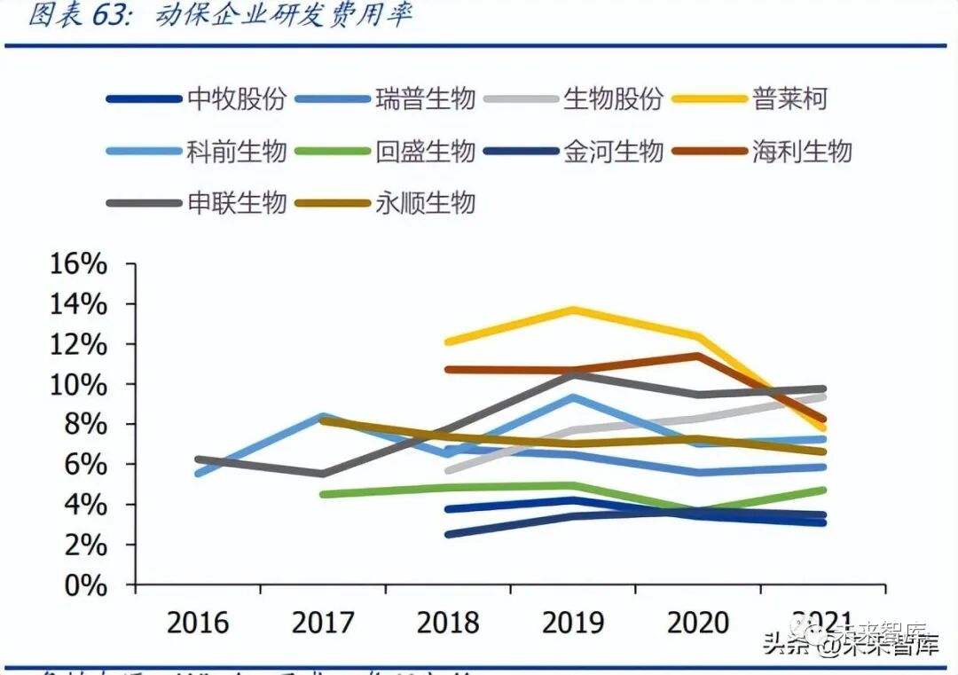 生药企业研发投入相对较高,龙头产品及工艺持续改善。对比动保企业研发费用投入 情况,行业规模领先龙头在研发投入方面亦领先行业平均水平,且兽用生药业务为主企 业研发投入通常高于化药企业,主要由于生药产品研发投入通常更高,能够以更高的研 发投入构建竞争壁垒,而化药研发水平差异主要体现在产品研发审批上市时间领先行业, 以及同一类仿制药生产工艺差异带来的产品品质差异,亦能形成产品力护城河。